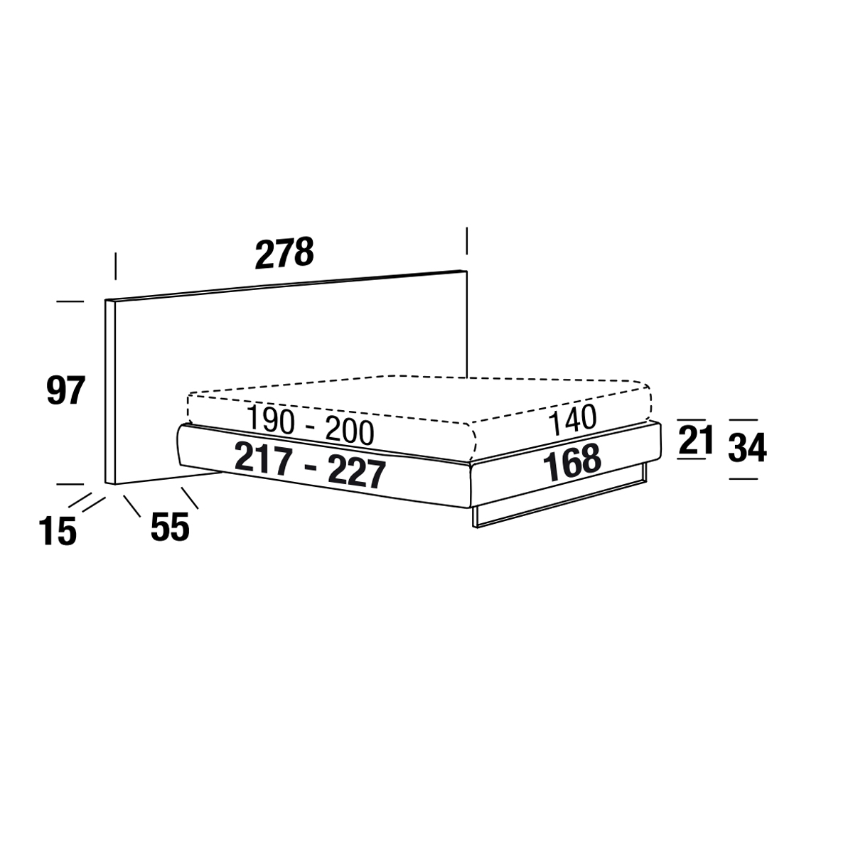 Letto Bowie XL Ring Kobe piazza e mezza Felis è il letto di design dalle linee essenziali e dai volumi importanti per questo letto che esprime un vero e proprio concept d’arredo. Nonostante il piede da 13 cm, con un semplice gesto, la rete si solleva svelando un capace contenitore all’interno del giroletto. Gli elementi a bordo letto inoltre possono essere utilizzati come delle comode sedute. Optional i cuscini. I bordi in contrasto, sottolineano le forme della testiera e del giroletto. I tavolini, realizzati in metallo verniciato grigio piombo, possono scorrere sul giroletto. I tavolini in metallo curvato sono inseribili nel giroletto e diventano comodini, panche e sedute a seconda delle esigenze. Più funzioni quindi con design leggero e versatile. Sono disponibili a richiesta anche i cuscini a misura per l’utilizzo seduta. RETI - per livellare alla stessa altezza reti diverse nello stesso letto MECCANISMI 1. DYNAMIC: meccanica ad alzata semplice collaudata e certificata fino a 5.000 cicli. Telaio in acciaio verniciato a polveri epossidiche e con molle a gas tarate al peso del materasso. CONTENITORE NEL RING