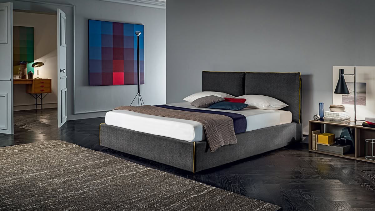Letto Tim B Ring York matrimoniale Felis è il letto di design dall'eleganza della semplicità. Luis ha un cordoncino in colore a contrasto sui bordi dei grandi cuscini della testiera e sugli angoli di giunzione ai piedi del giroletto, un particolare mai banale, che può completamente cambiare l’aspetto del nostro letto. RETI - per livellare alla stessa altezza reti diverse nello stesso letto MECCANISMI 1. DYNAMIC: meccanica ad alzata semplice collaudata e certificata fino a 5.000 cicli. Telaio in acciaio verniciato a polveri epossidiche e con molle a gas tarate al peso del materasso. CONTENITORE NEL RING