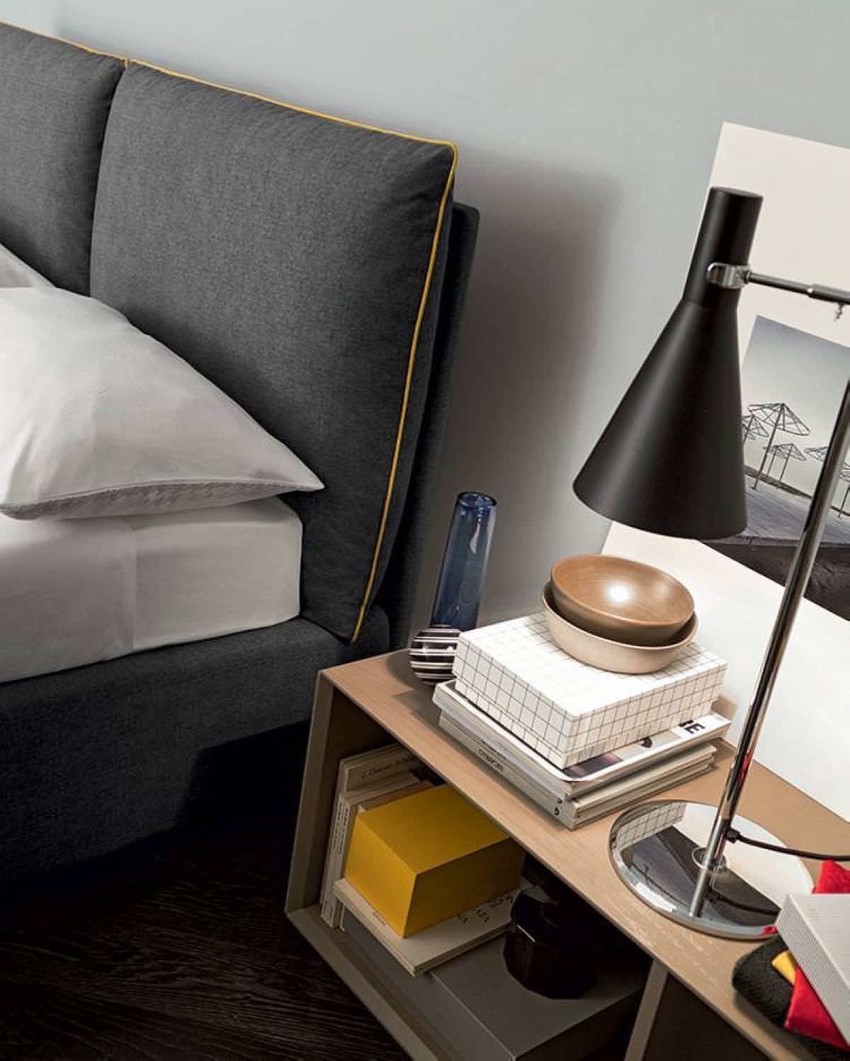 Grazie all’innovativa soluzione dei cuscini reclinabili le testiere sono relax system, consentono cioè una comoda posizione “seduta” e un pratico appoggio di sostegno per leggere, guardare la tv, lavorare al laptop. Le piccole gioie, il telefono, l’orologio: i tanti oggetti quotidiani trovano posto nei portaoggetti alla base della testiera. Una soluzione pratica per averli sempre in ordine e a portata di mano. Le nicchie sono attrezzabili anche con una torretta caricabatteria: basta una leggera pressione per farla uscire e, una volta utilizzata, scompare.