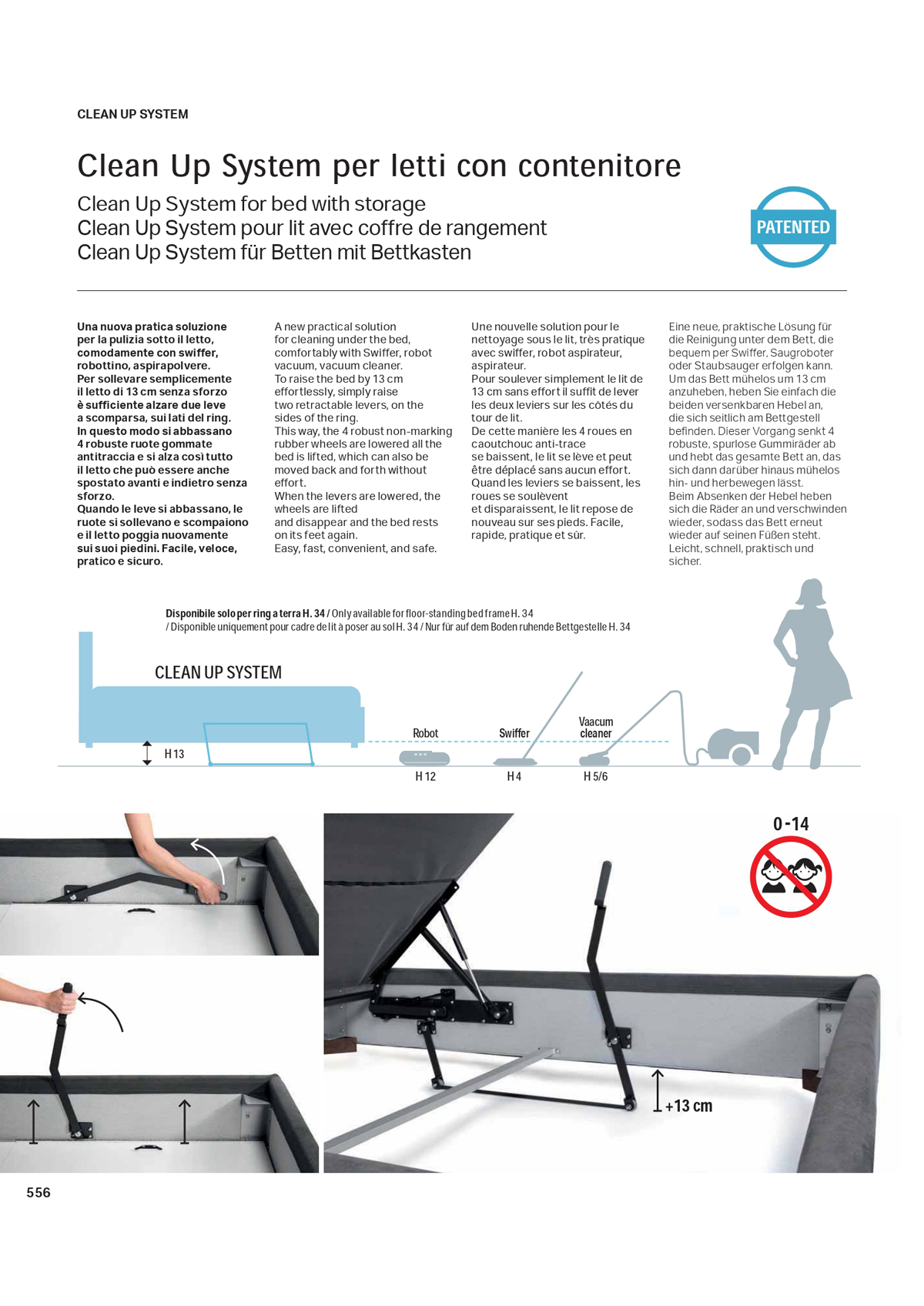 Una nuova pratica soluzione per la pulizia sotto il letto, comodamente con swiffer, robottino, aspirapolvere. Per sollevare semplicemente il letto di 13 cm senza sforzo è sufficiente alzare due leve a scomparsa, sui lati del ring. In questo modo si abbassano 4 robuste ruote gommate antitraccia e si alza così tutto il letto che può essere anche spostato avanti e indietro senza sforzo. Quando le leve si abbassano, le ruote si sollevano e scompaiono e il letto poggia nuovamente sui suoi piedini. Facile, veloce, pratico e sicuro.