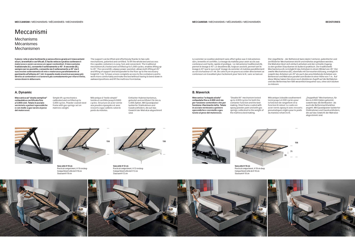 2. MAVERICK: meccanica a "doppia alzata" collaudata fino a 4000 cicli sia per funzione contenitore che per funzione rifacimento letto. Telaio in acciaio verniciato a polveri epossidiche e con molle a gas tarate al peso del materasso.
