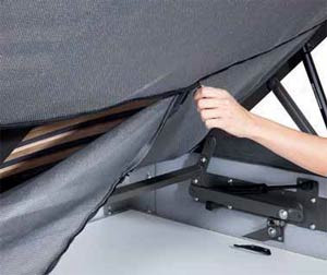 Il piano-rete si alza facilmente e senza sforzo grazie ai due meccanismi sicuri, brevettati E certificati. È facile e veloce e pratico sollevare il materasso e avere accesso ai capaci- contenitori. Il meccanismo tradizionale (A.), consente il sollevamento a 45°. Il secondo (B.), sempre servoassistito, consente sia il sollevamento a 45°, sia il successivo sollevamento di rete e materasso parallelamente al pavimento all'altezza di un metro punto in questo modo si avrà un accesso più diretto ai contenitori e si lavorerà più comodamente per rifare il letto, senza doversi abbassare.