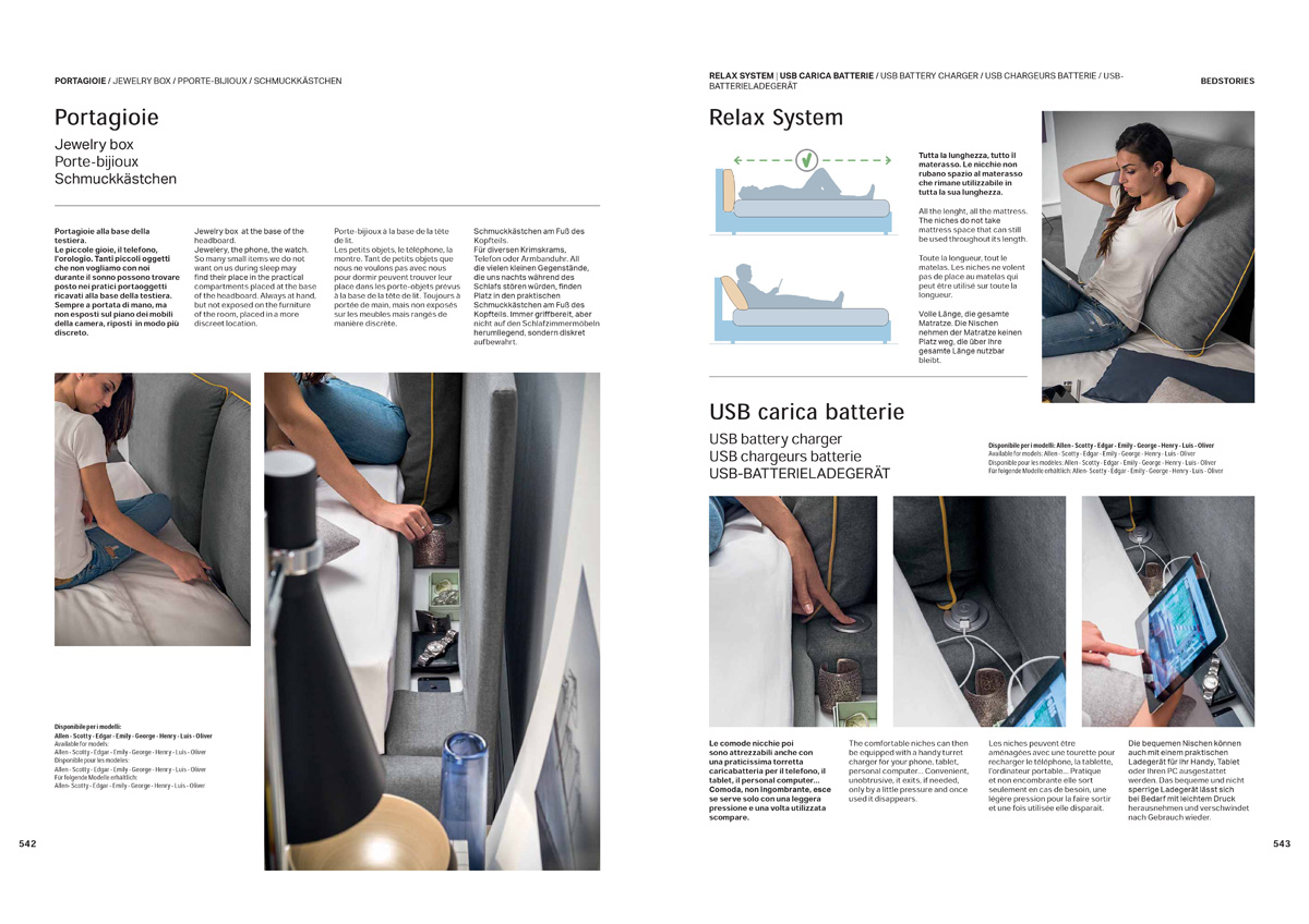 Grazie all’innovativa soluzione dei cuscini reclinabili le testiere sono relax system, consentono cioè una comoda posizione “seduta” e un pratico appoggio di sostegno per leggere, guardare la tv, lavorare al laptop. Le piccole gioie, il telefono, l’orologio: i tanti oggetti quotidiani trovano posto nei portaoggetti alla base della testiera. Una soluzione pratica per averli sempre in ordine e a portata di mano. Le nicchie sono attrezzabili anche con una torretta caricabatteria: basta una leggera pressione per farla uscire e, una volta utilizzata, scompare.