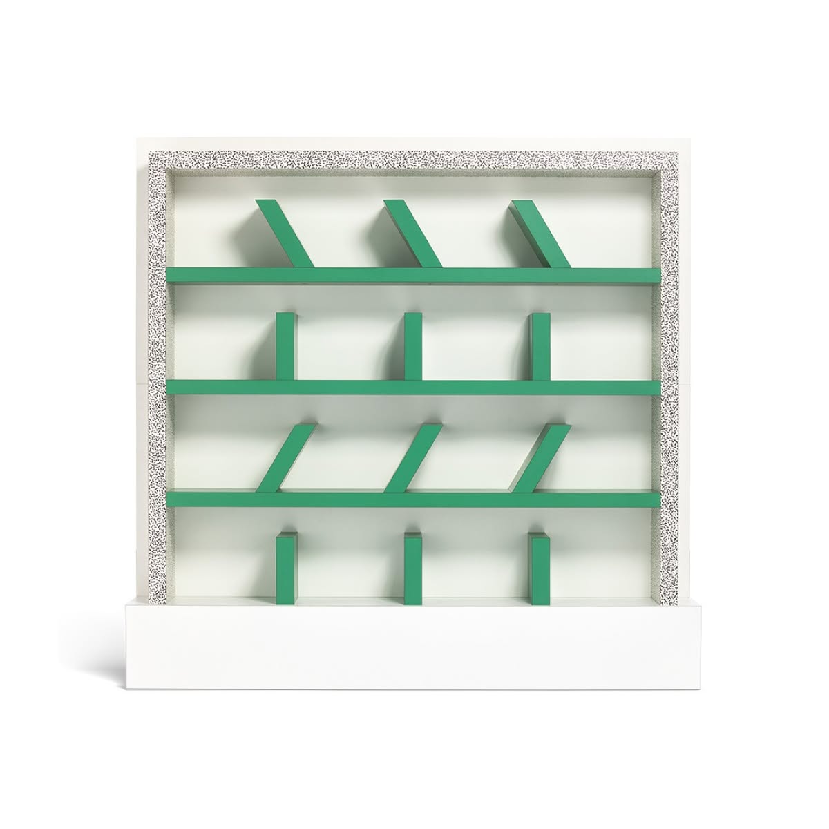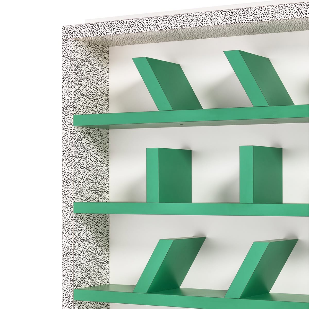 Memphis Milano Suvretta Libreria di Ettore Sottsass è una libreria di design in legno rivestito in laminato decorativo, progettata da Ettore Sottsass nel 1981, Suvretta presenta degli scaffali non convenzionali, poiché gli angoli in tutte le file sono diversi l'uno dall'altro. “Suvretta” è una parola Romancia (lingua parlata in Engadina) che significa: “sopra alla piccola foresta”. Come filari di alberi sovrapposti, i libri appoggiati sui ripiani verdi di Suvretta , assumono un andamento ritmico in verticale e in diagonale. I tre elementi divisori dei ripiani di colore verde vibrante di Suvretta si alternano in maniera inclinata e verticale generando una composizione semplice e dinamica enfatizzata dallo fondo bianco e incorniciata dalla decorazione del laminato plastico con la texture “Bacterio” (disegnata sempre da Sottsass).