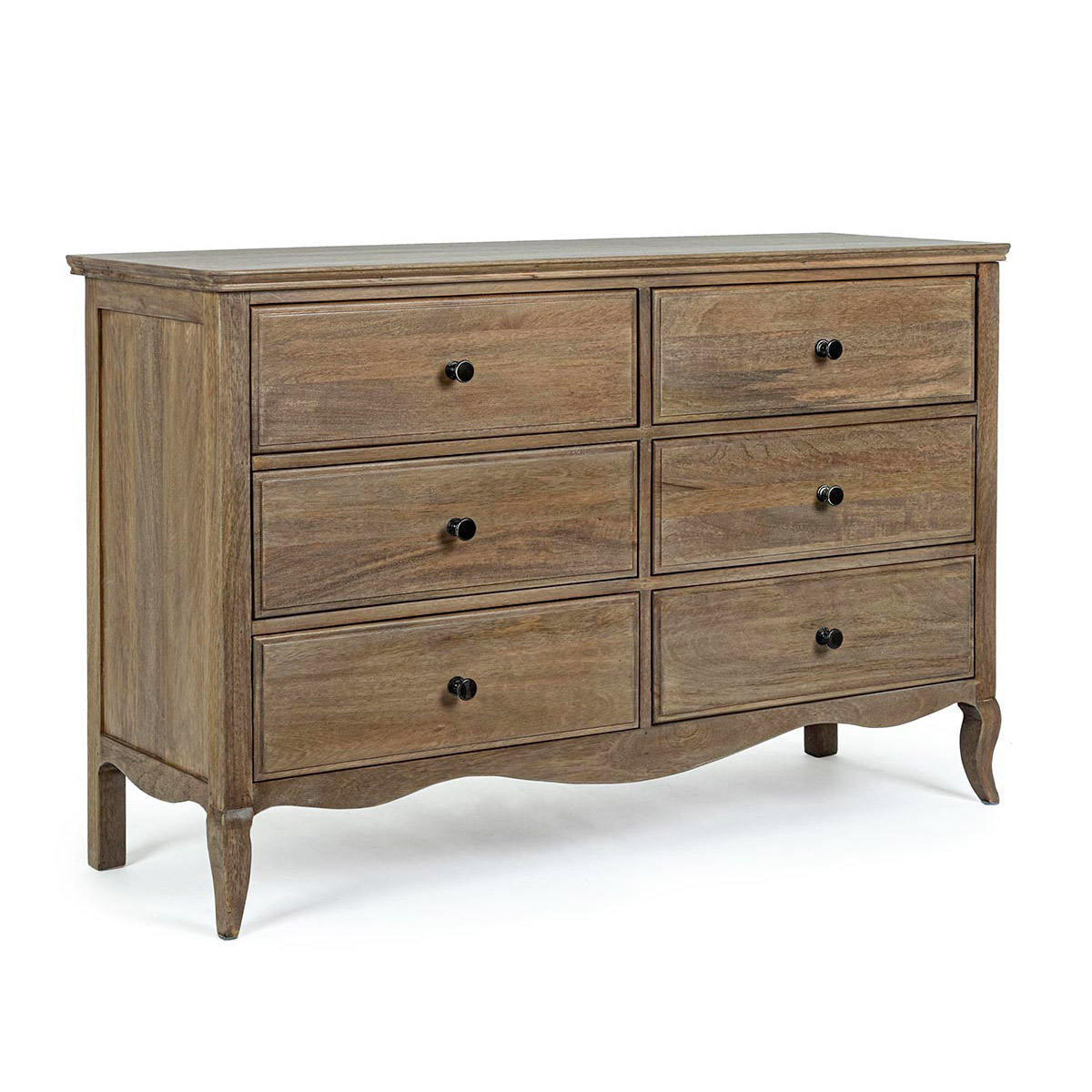 Cassettiera 6c Domitille by Bizzotto è un mobile contenitore di design con struttura in legno di mango, fondo cassetti in mdf e finitura con vernice a base d'acqua. Maniglie in ghisa. Gambe da assemblare.