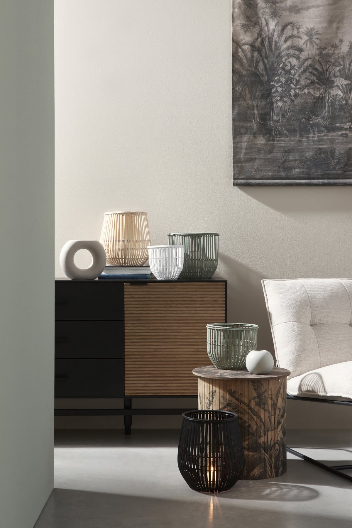 Credenza 2A-3C Allycia nero-naturale by Bizzotto è un mobile contenitore di design con struttura in legno di frassino. Piano, schienale e ripiani in mdf. Frontale ante e cassetti in legno di frassino. Finitura vernice a base d'acqua. Maniglie in acciaio. Da assemblare.