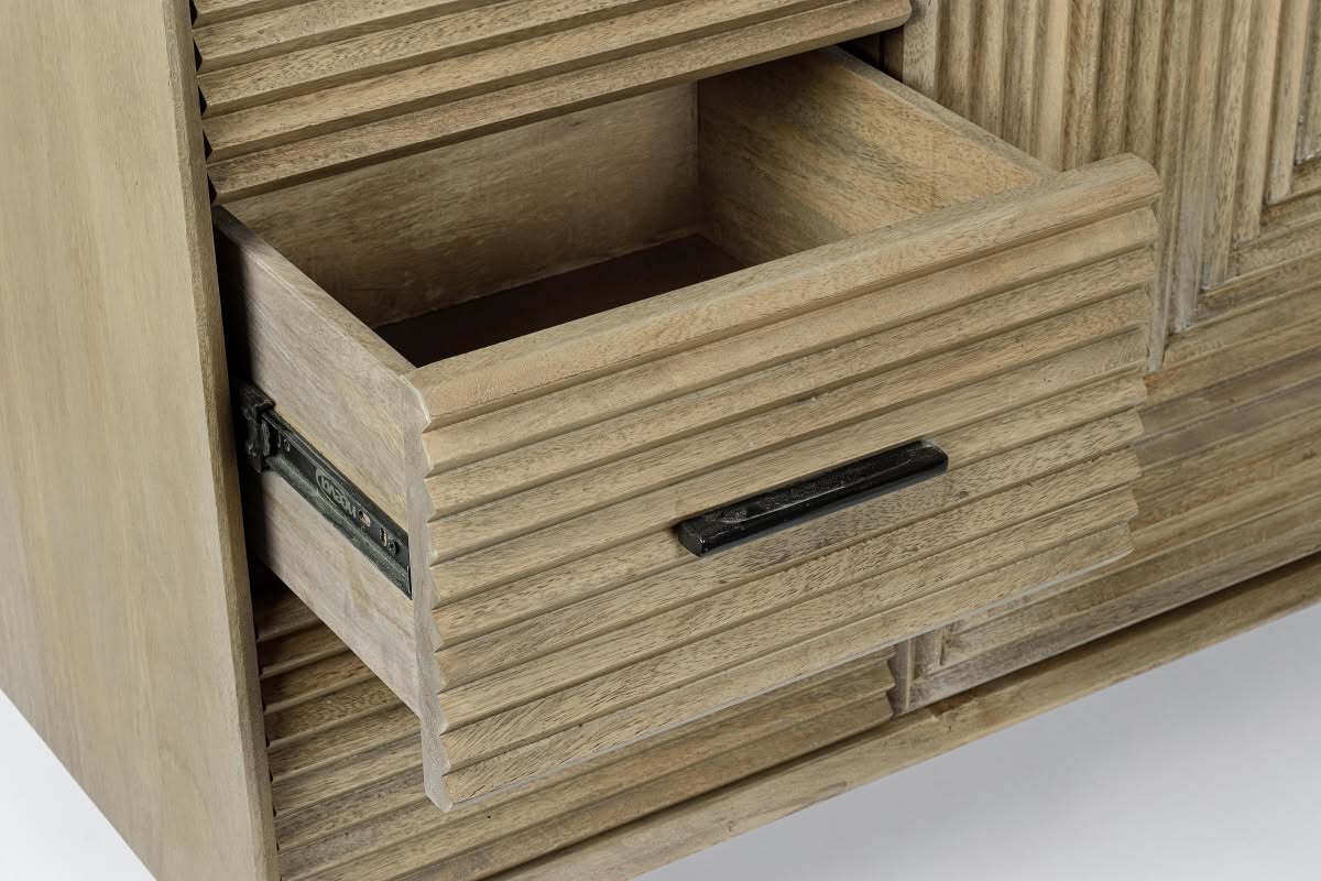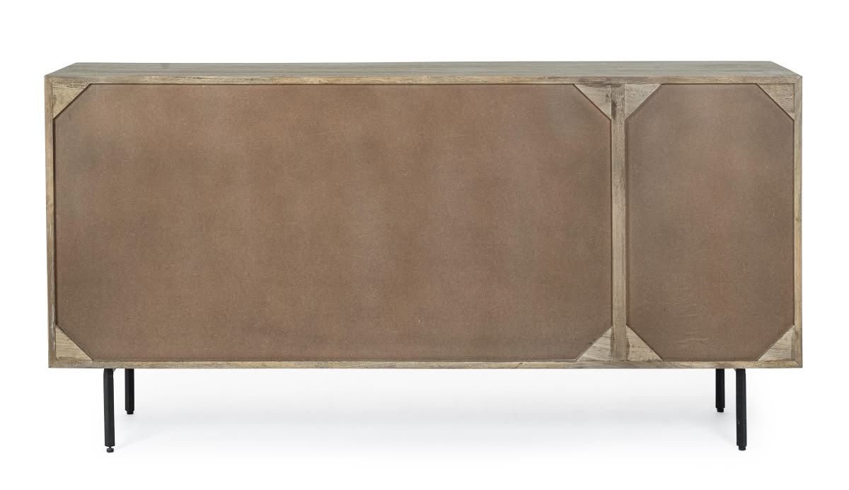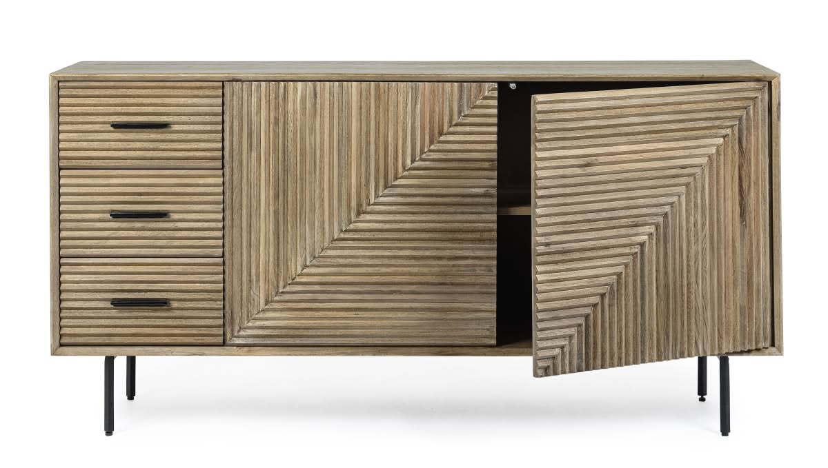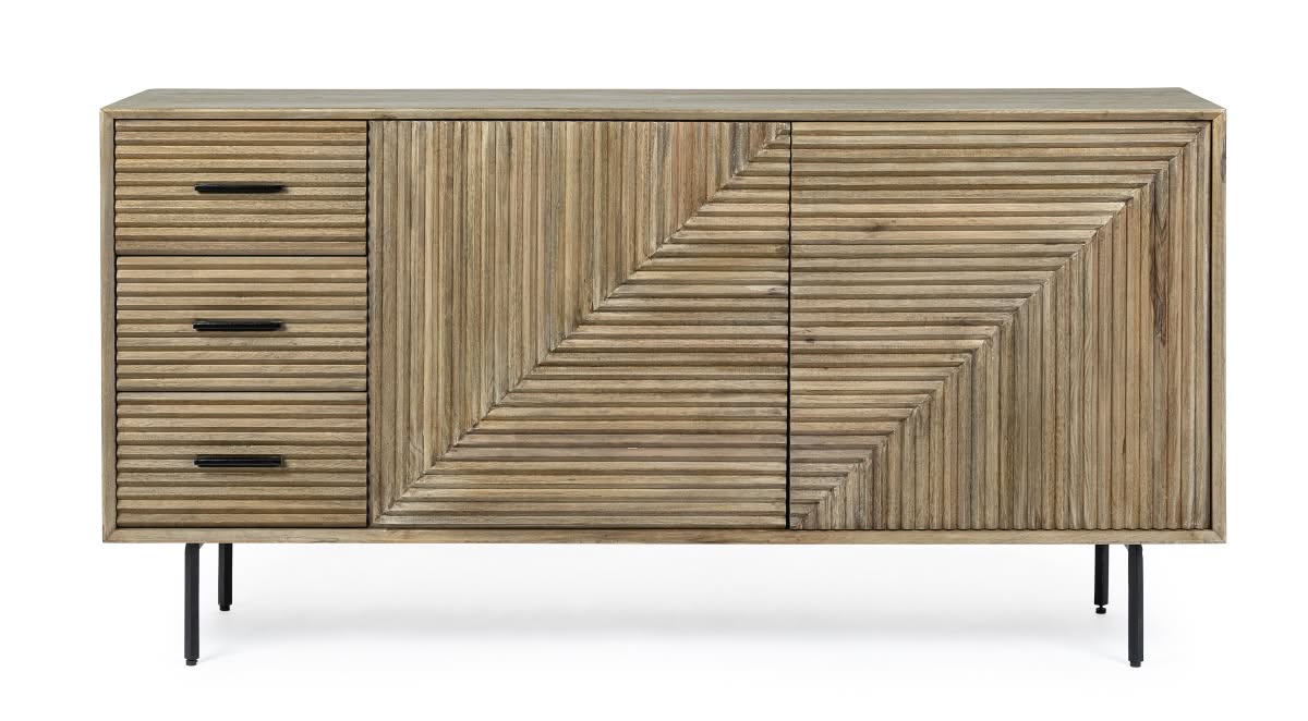 Credenza 2A-3C Darsey by Bizzotto è un mobile contenitore di design a 2 ante e 3 cassetti con struttura in legno di mango, schienale in mdf e finitura con vernice a base d'acqua. Gambe in acciaio da assemblare.