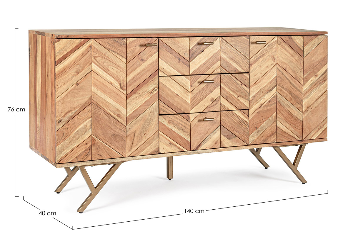 La Credenza 2A-3C Raida by Bizzotto è una credenza di design con struttura in legno di Acacia, schienali ed interno cassetti in compensato, finitura a base di vernice poliuretanica, gambe in acciaio verniciato a polvere epossidica. Gambe da assemblare.