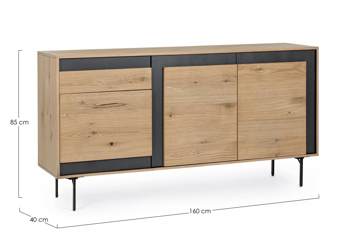 Credenza 3A-1C Stanwood by Bizzotto è un mobile contenitore di design con struttura in Mdf impiallacciato rovere. Finitura naturale con vernice a base d'acqua. Vano porte comprensivo di mensola. Interno cassetti di colore nero con guide scorrevoli in acciaio. Gambe in acciaio verniciate a polvere epossidica. Gambe da assemblare.