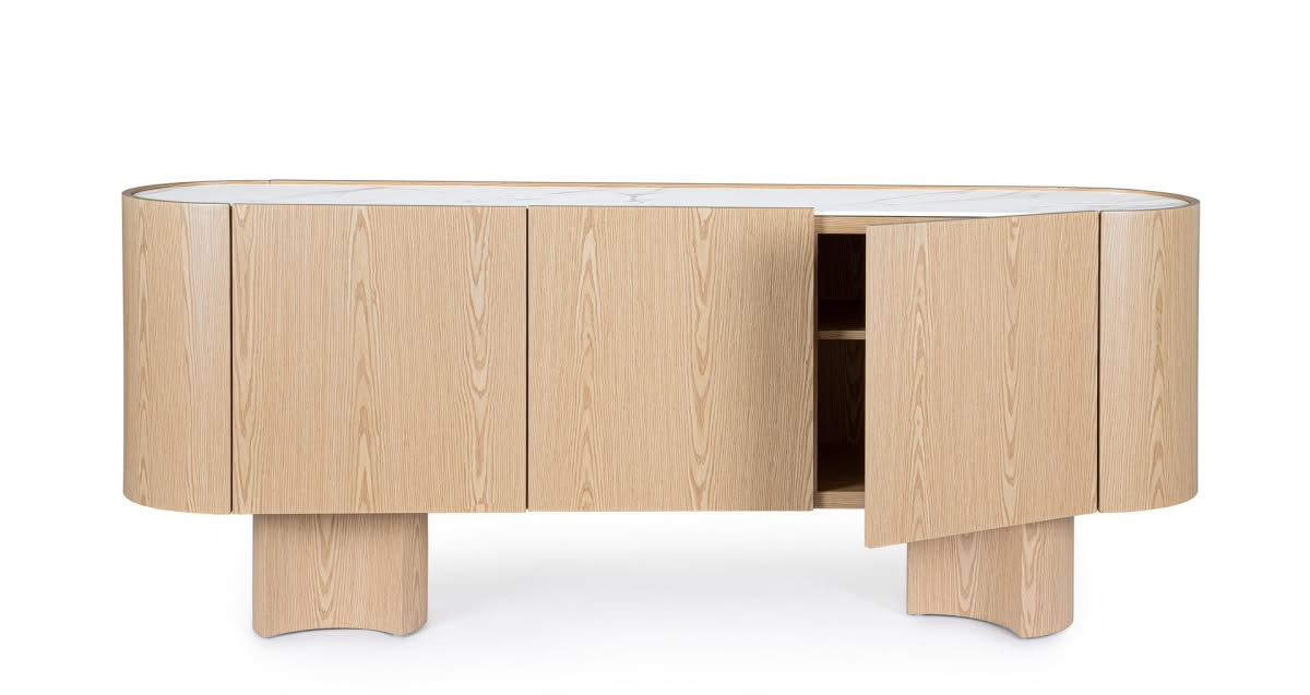Credenza 3A Otilia Oak by Bizzotto è un mobile contenitore di design con struttura in mdf impiallacciato legno di quercia, piano in pietra sinterizzata (pietra naturale lavorata ad elevate temperature). Finitura a base di vernice poliuretanica. Ante con cerniere chiusura ammortizzata. Vano porta comprensivo di mensola. Piedini da assemblare.
