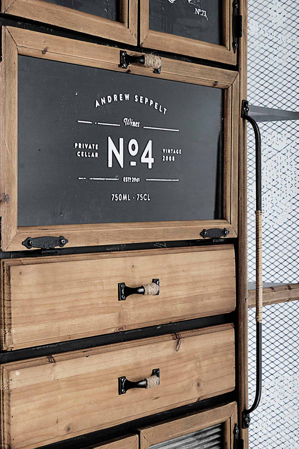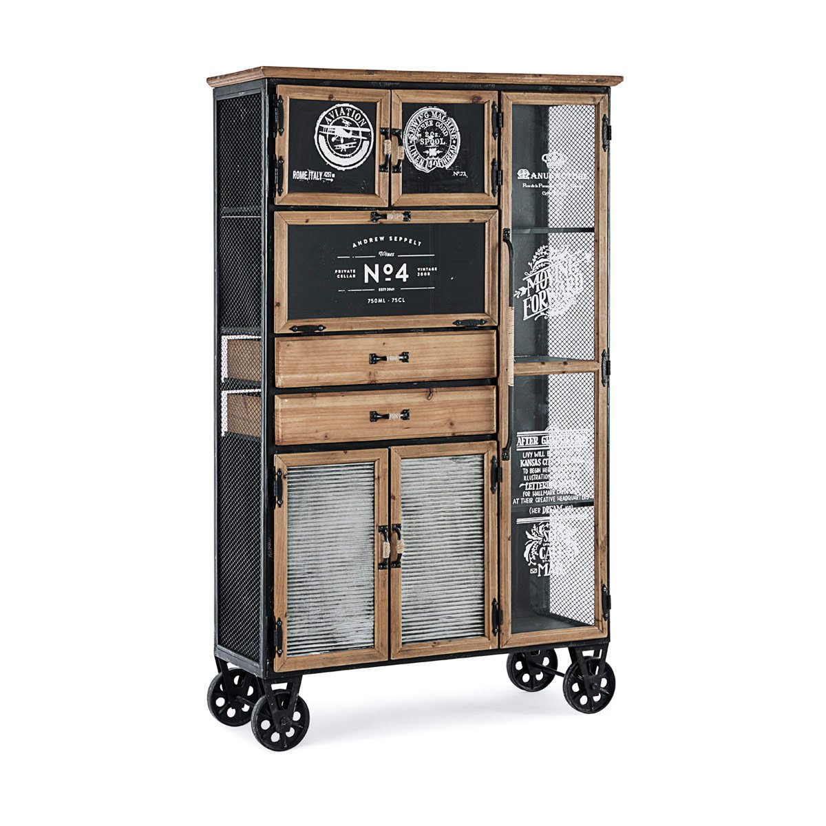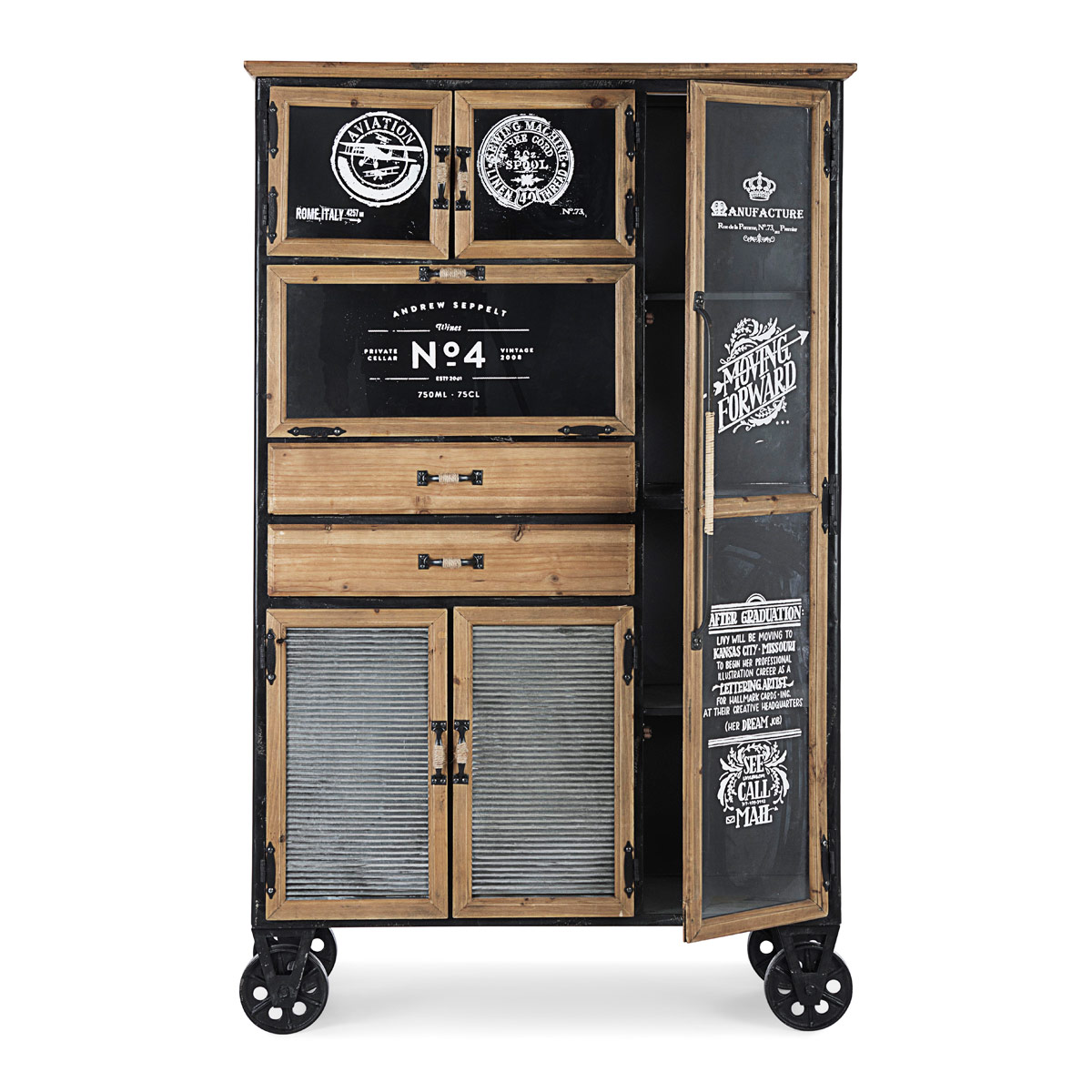 Il Mobile con ruote 6a-2c Liverpool è un mobile di design con struttura e ripiani in acciaio verniciati a polvere epossidica, ante e cassetti con cornice in legno di pino con finitura a base di nitrocellulosa e maniglie e ruote in acciaio.