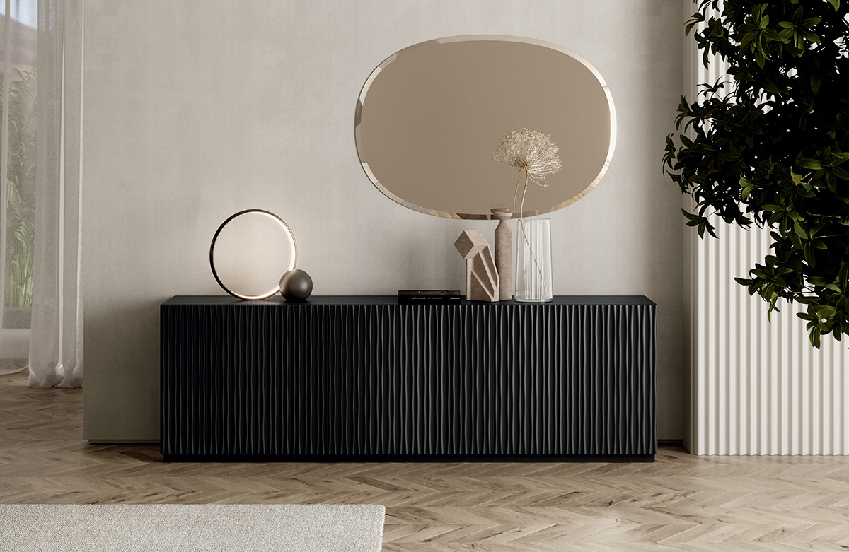 Musa 15.47 firmato Bontempi Casa è la madia di design 216x46,5 con struttura in legno, composta da n.3 ante a battente, ripiani interni in cristallo trasparente, fianchi in legno laccato antracite o nero ed ante in legno impiallacciato Rovere spessart, impiallacciato Noce, laccato antracite o laccato nero. Musa è l’interpretazione all’avanguardia della naturalezza e della poliedricità del legno. La madia dal design puro e lineare incanta per la texture delle ante a battente percorse da scanalature in altezza che creano un motivo grafico sulla superficie con un armonico gioco di luci e ombre e un effetto tridimensionale. Questa lavorazione conferisce grande carattere stilistico a un classico dell’arredamento. Schienale non a vista, si consiglia ancoraggio a muro.