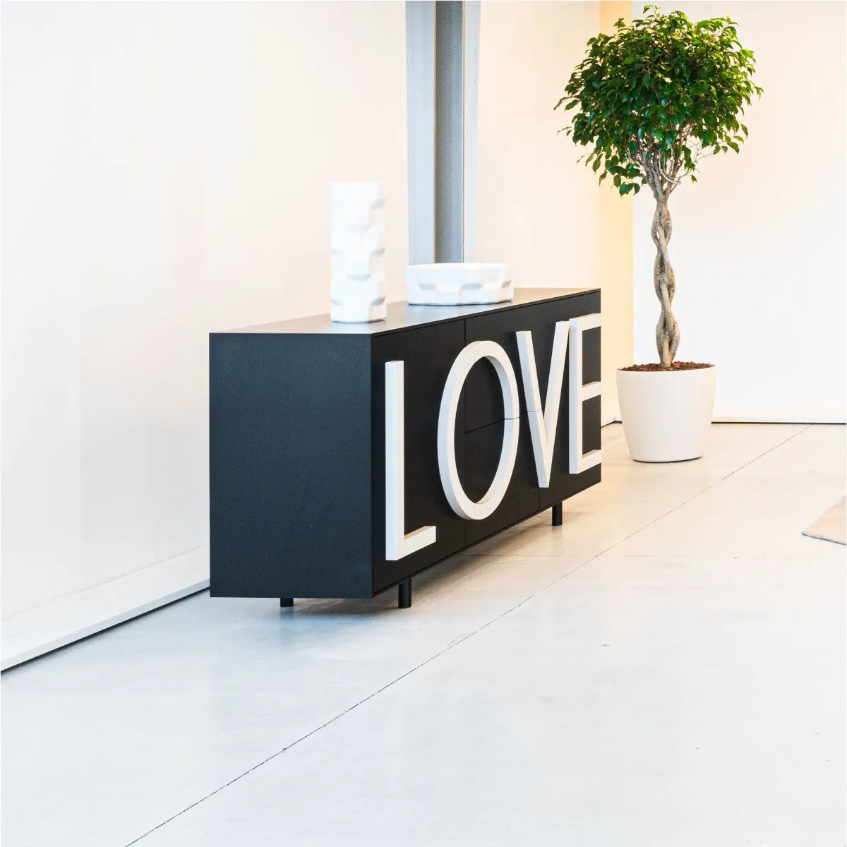 Con la sua forma caratterizzante e tutta da scoprire, la madia LOVE (cabinet) costituisce un manifesto espressivo, un poster bidimensionale che parla d’amore. Dal connubio tra estetica e funzione, le linee diventano tridimensionali, il foglio si estrude diventando contenitore e le lettere escono dal foglio generando delle maniglie, elementi versatili e disponibili in vari colori. «Amore è scegliersi a scatola chiusa, avvolti da un alone di mistero. Amore è un fedele custode di sogni condivisi, un contenitore di possibilità» Fabio Novembre