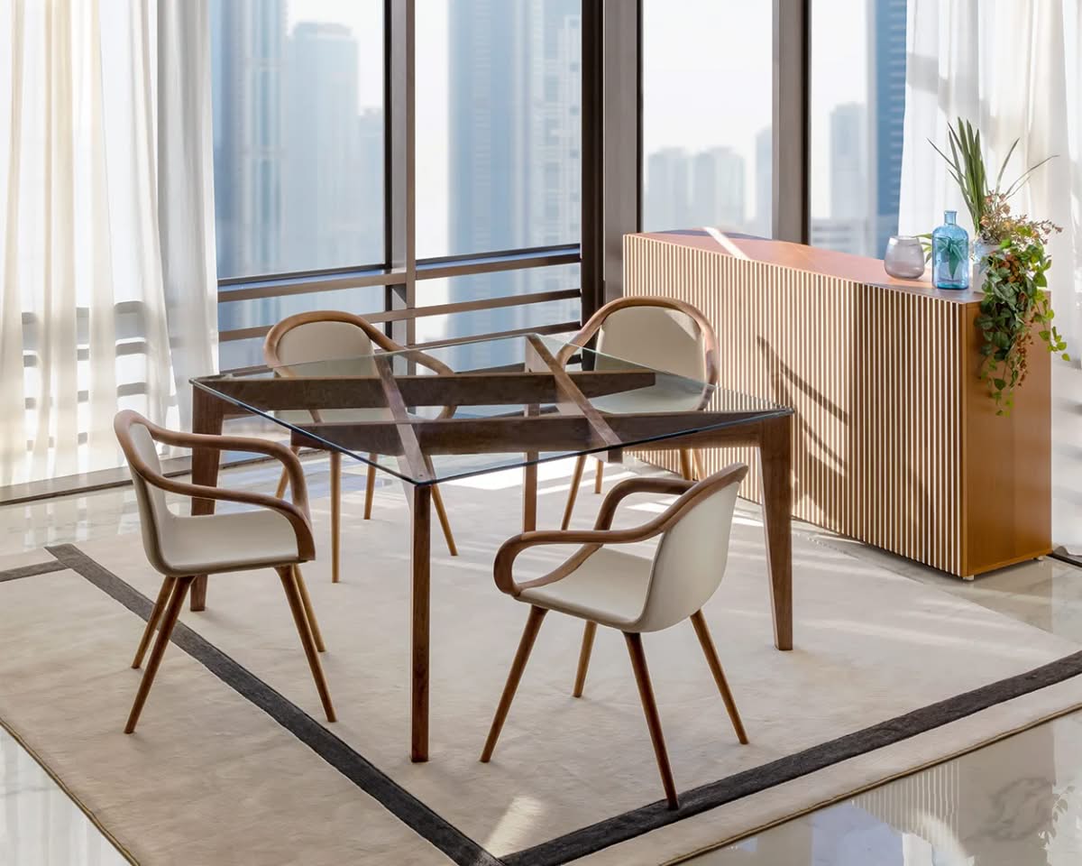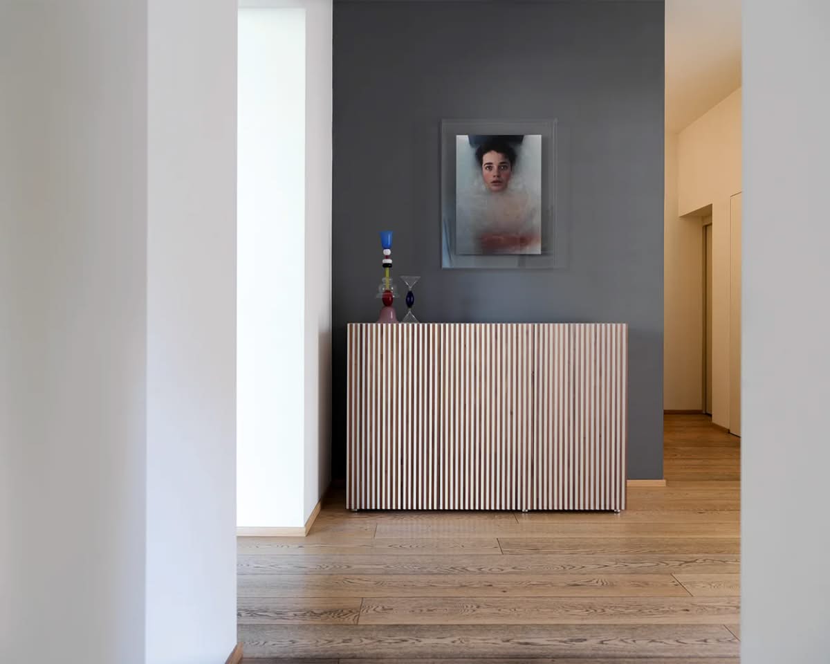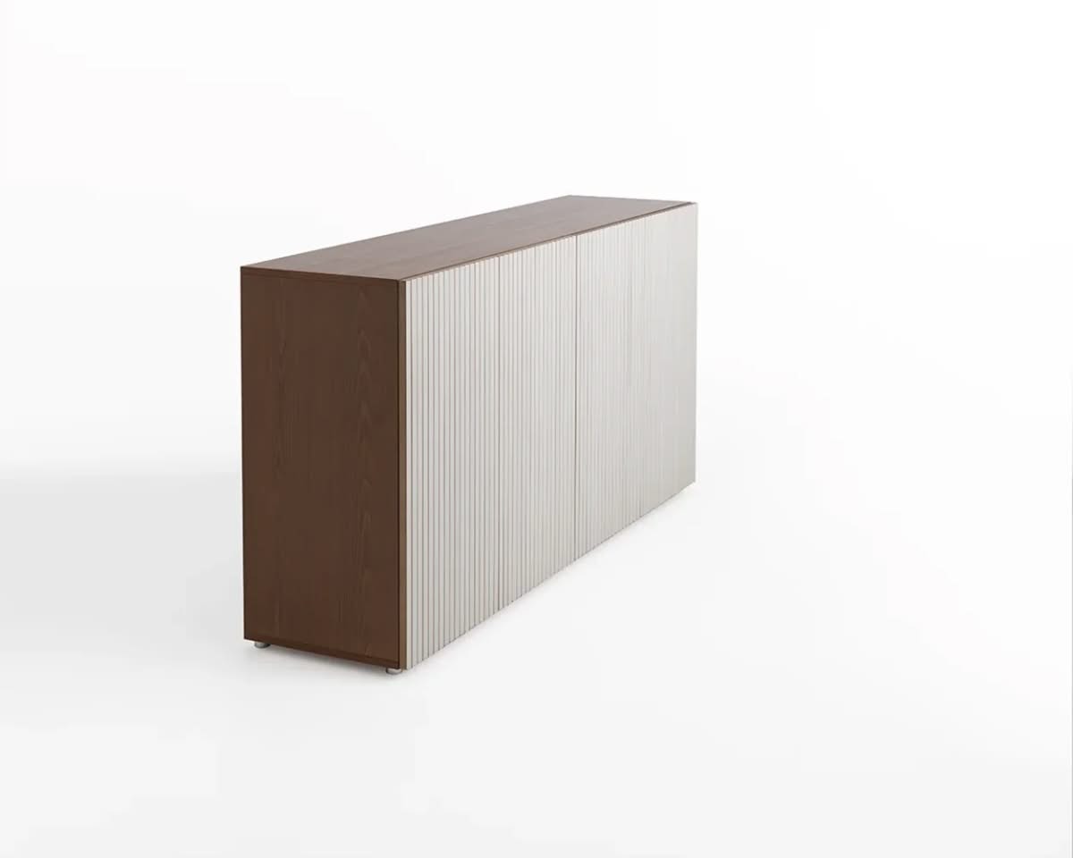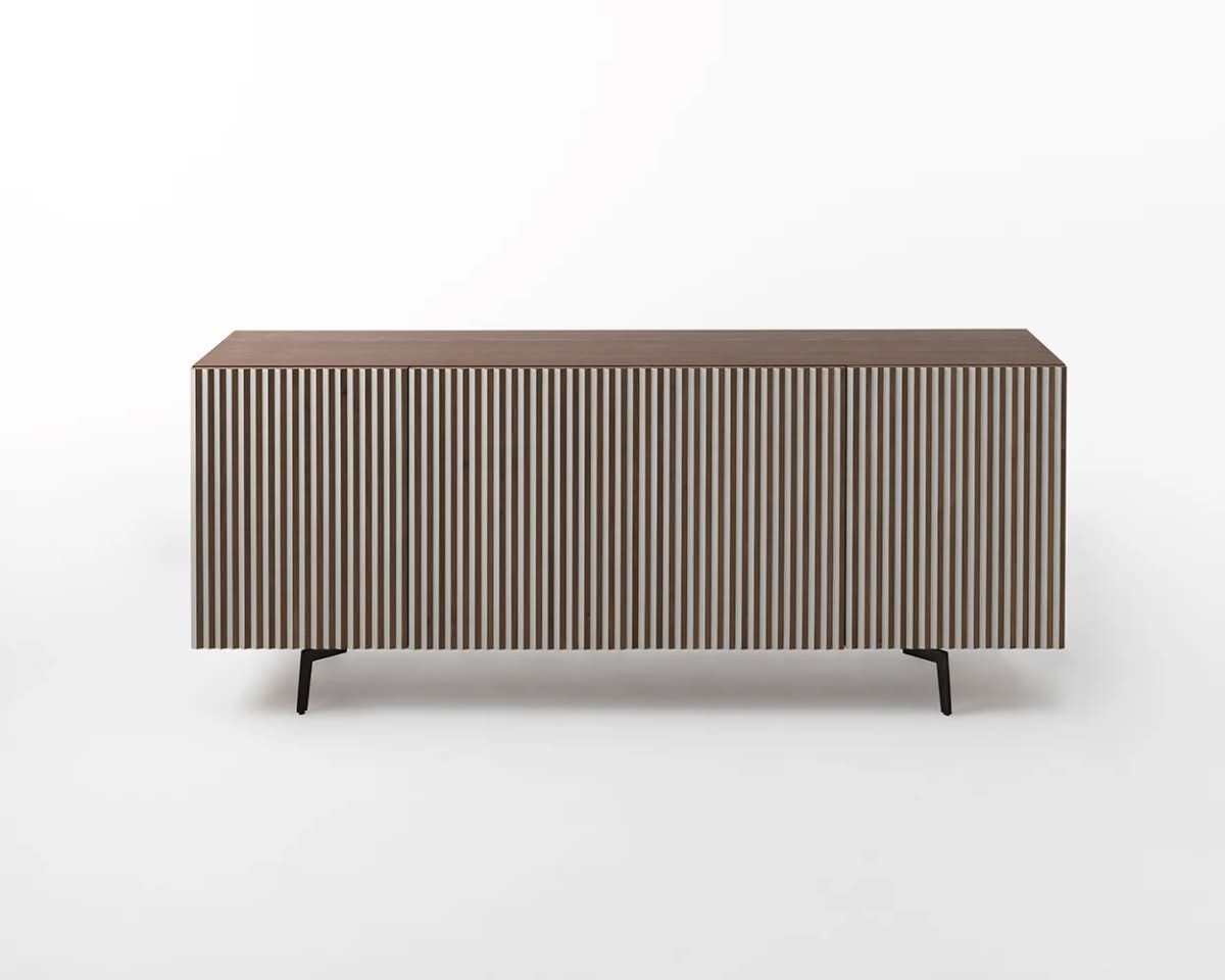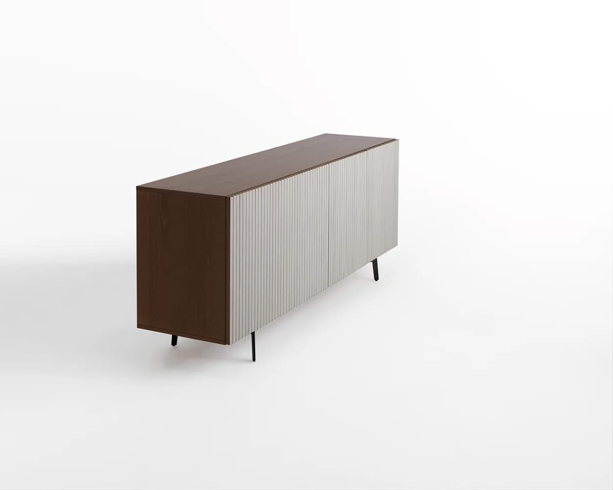 Leon Wood Bois Blond Madia di Horm è il mobile contenitore di design con struttura e ante in pannelli di particelle di legno o in MDF impiallacciati e tinti. Inserti a sezione triangolare in legno massello di faggio tinto. Ripiani interni in vetro temperato. Leon Wood celebra l'essenzialità della forma e della materia. Il ritmo verticale del legno diventa un gioco di luci e ombre, arricchito dalla texture e dalle venature naturali della superficie. Elegante, caldo e discreto, Leon Wood si inserisce con naturalezza in interni raffinati, dove la bellezza risiede nella semplicità e nelle proporzioni.