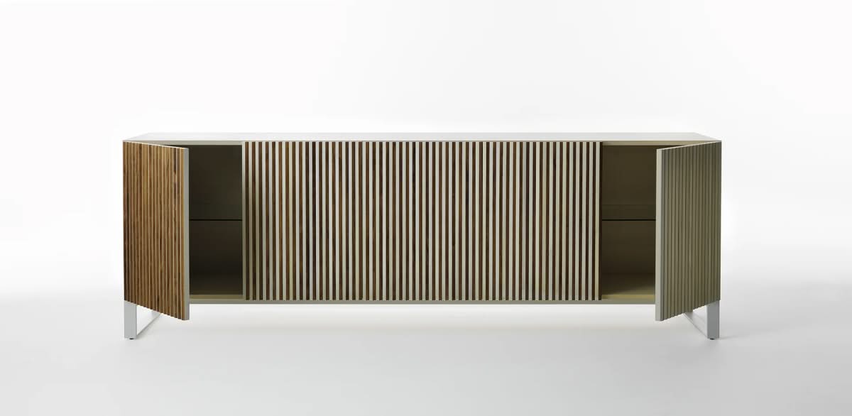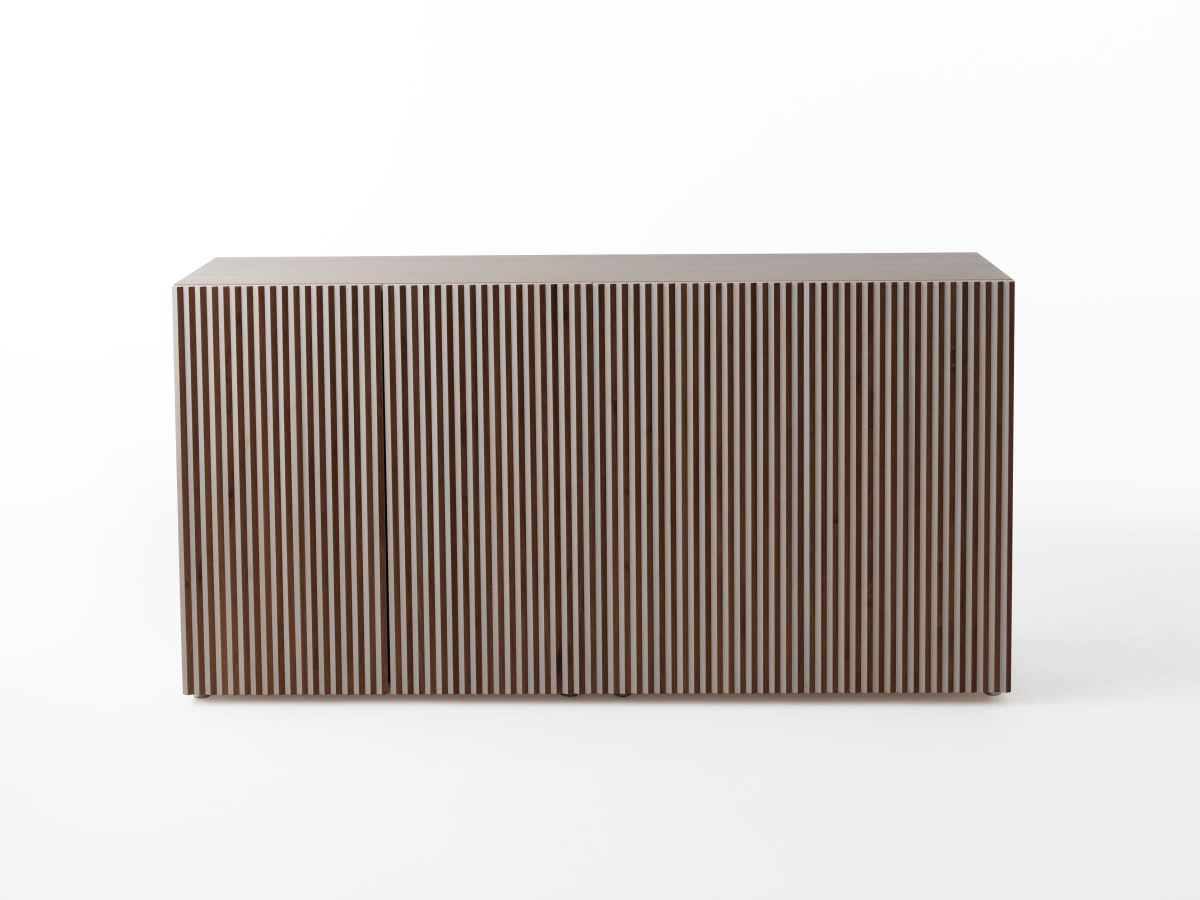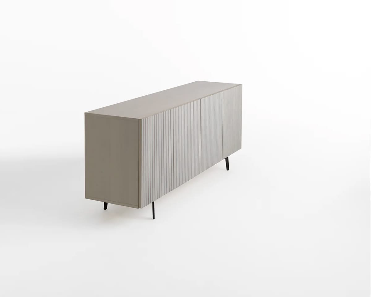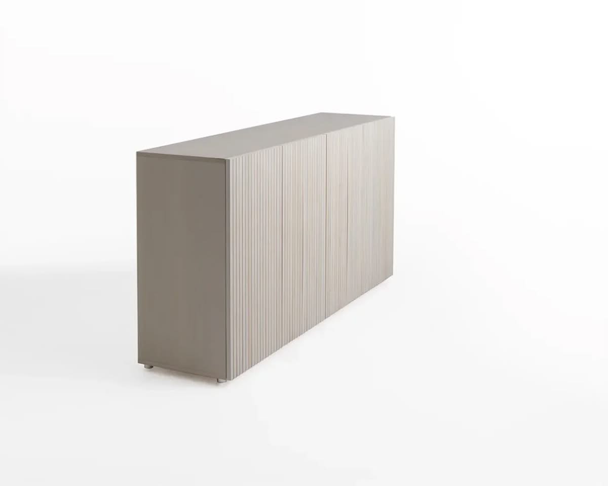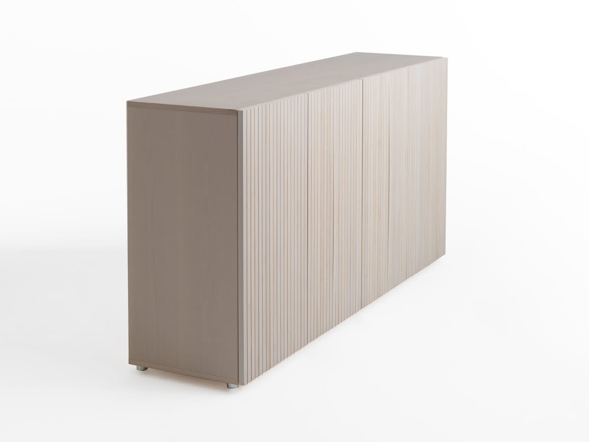 Leon Wood Imbiancato Madia di Horm è il mobile contenitore di design con struttura e ante in pannelli di particelle di legno o in MDF impiallacciati e tinti. Inserti a sezione triangolare in legno massello di faggio tinto. Ripiani interni in vetro temperato. Leon Wood celebra l'essenzialità della forma e della materia. Il ritmo verticale del legno diventa un gioco di luci e ombre, arricchito dalla texture e dalle venature naturali della superficie. Elegante, caldo e discreto, Leon Wood si inserisce con naturalezza in interni raffinati, dove la bellezza risiede nella semplicità e nelle proporzioni.