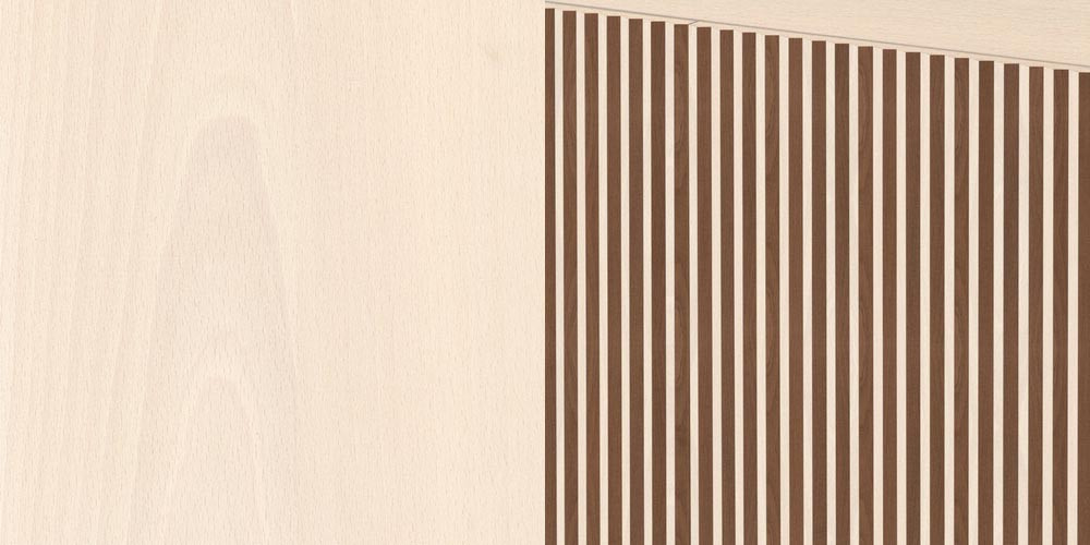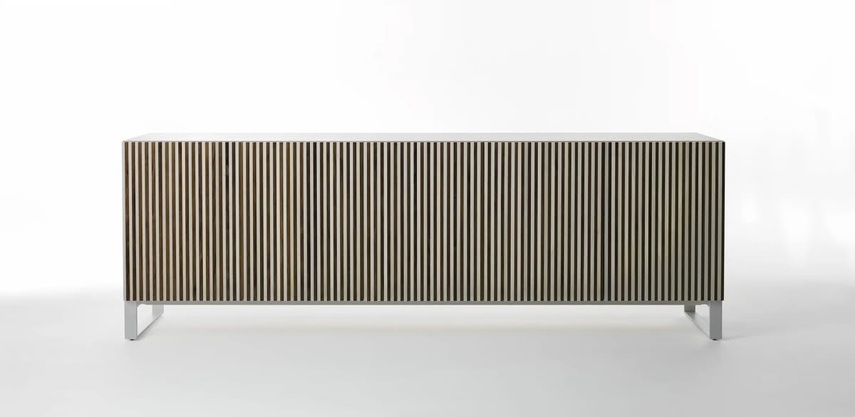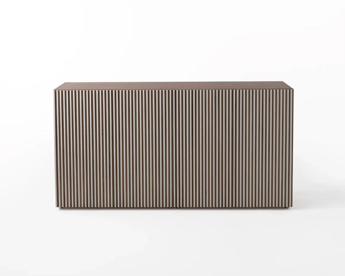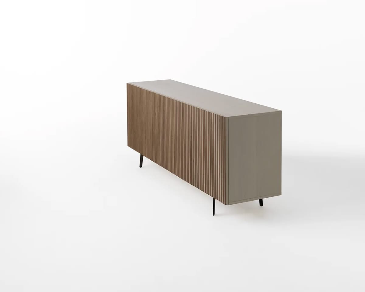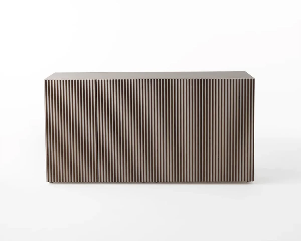 Leon Wood Imbiancato Madia di Horm è il mobile contenitore di design con struttura e ante in pannelli di particelle di legno o in MDF impiallacciati e tinti. Inserti a sezione triangolare in legno massello di faggio tinto. Ripiani interni in vetro temperato. Leon Wood celebra l'essenzialità della forma e della materia. Il ritmo verticale del legno diventa un gioco di luci e ombre, arricchito dalla texture e dalle venature naturali della superficie. Elegante, caldo e discreto, Leon Wood si inserisce con naturalezza in interni raffinati, dove la bellezza risiede nella semplicità e nelle proporzioni.