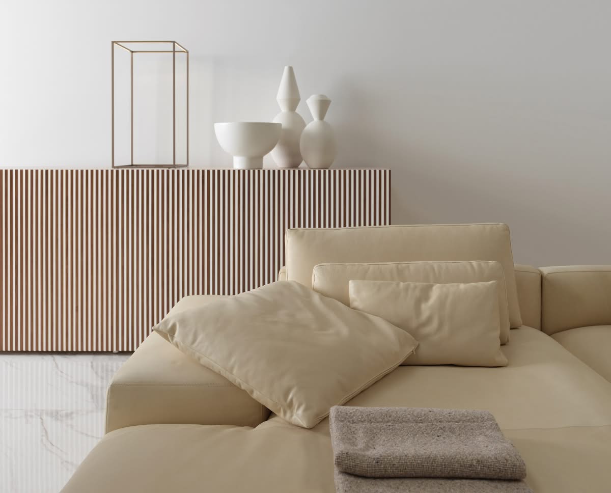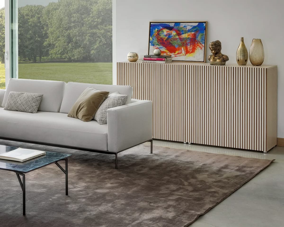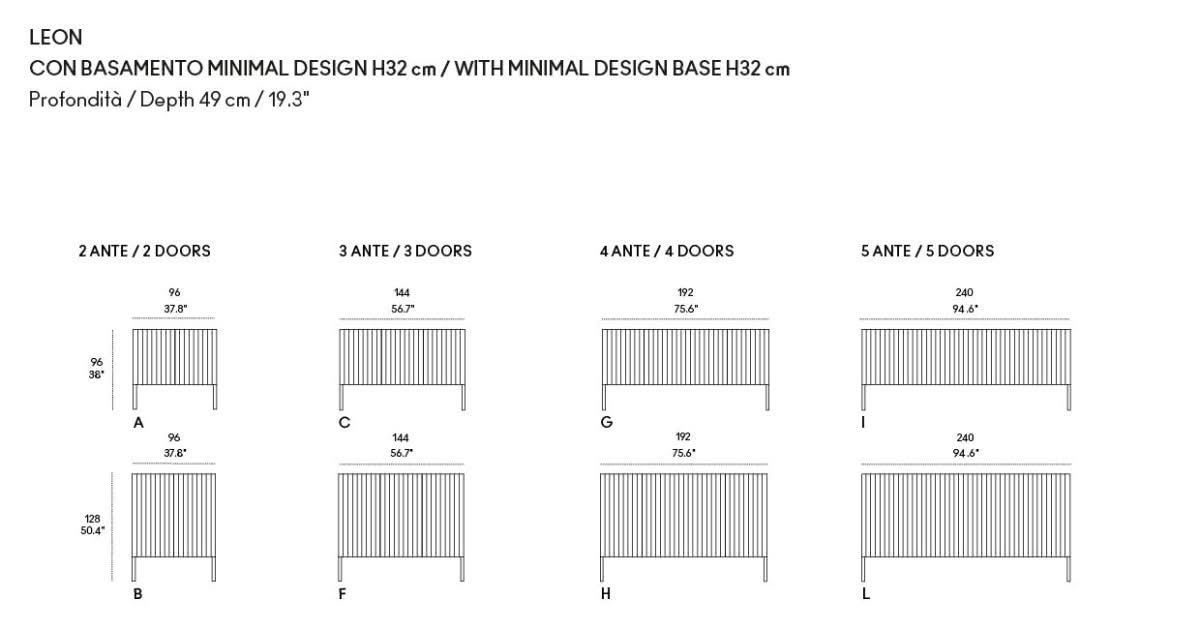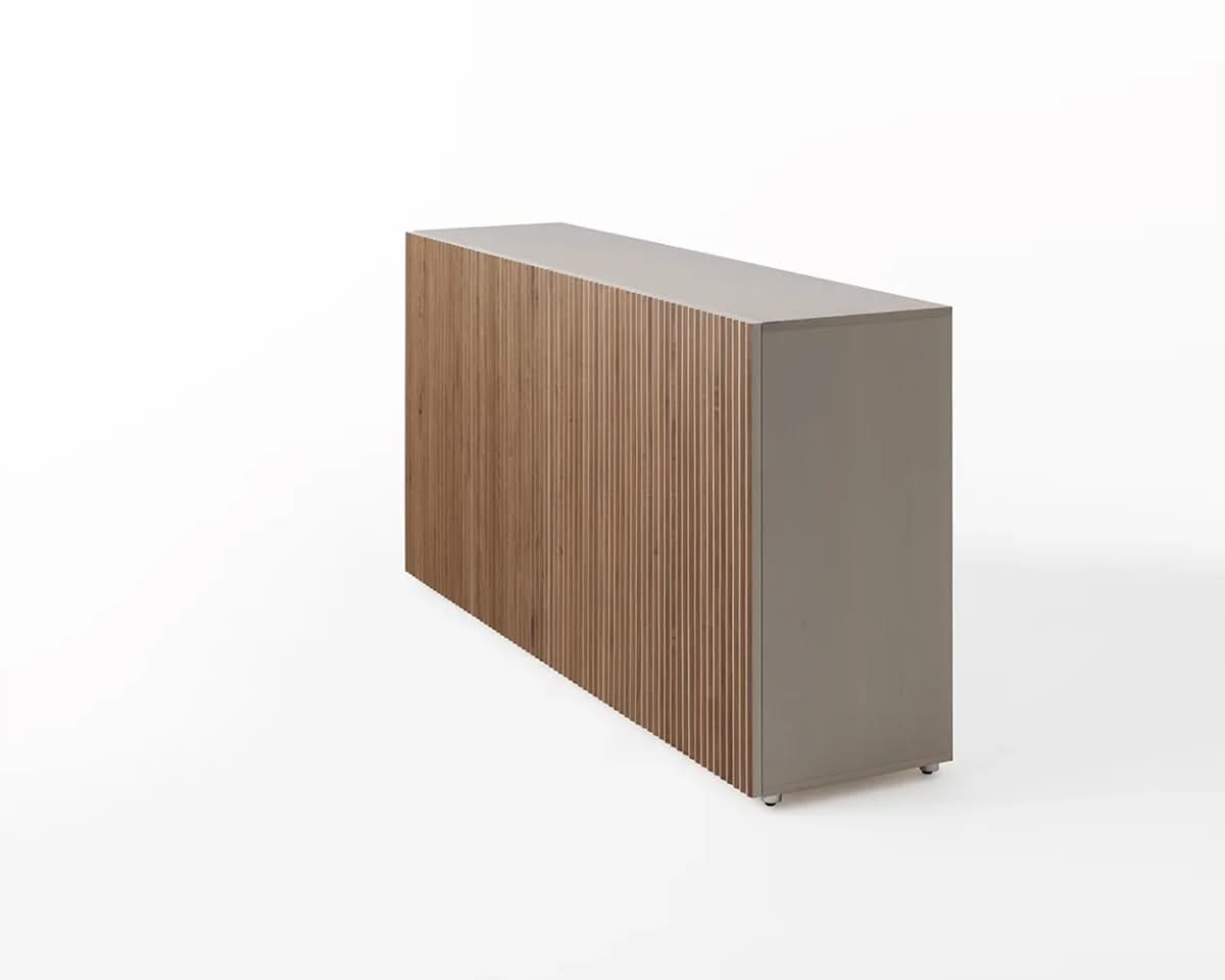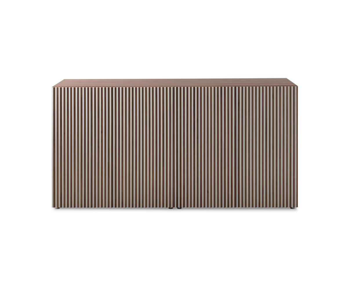 Leon Wood Imbiancato Madia di Horm è il mobile contenitore di design con struttura e ante in pannelli di particelle di legno o in MDF impiallacciati e tinti. Inserti a sezione triangolare in legno massello di faggio tinto. Ripiani interni in vetro temperato. Leon Wood celebra l'essenzialità della forma e della materia. Il ritmo verticale del legno diventa un gioco di luci e ombre, arricchito dalla texture e dalle venature naturali della superficie. Elegante, caldo e discreto, Leon Wood si inserisce con naturalezza in interni raffinati, dove la bellezza risiede nella semplicità e nelle proporzioni.