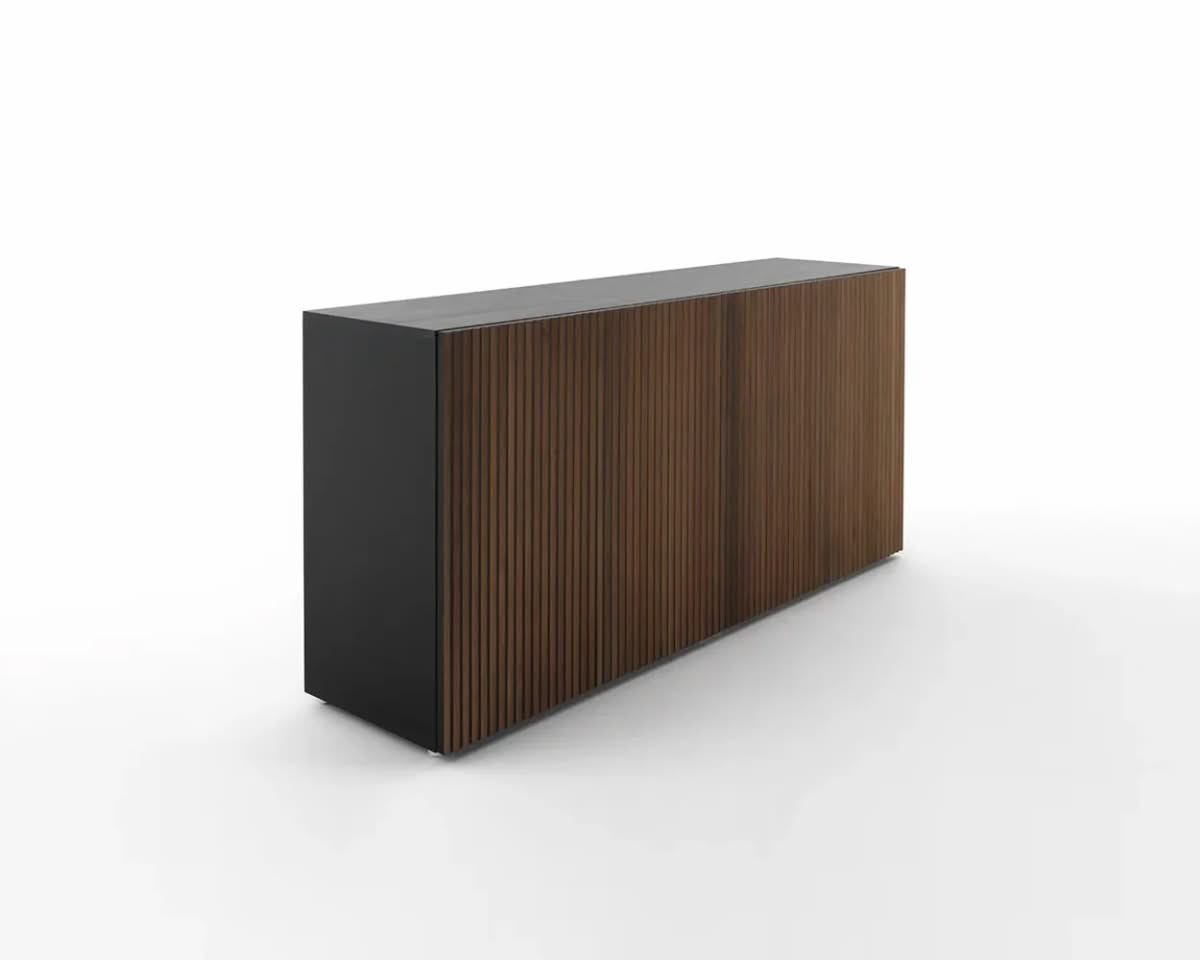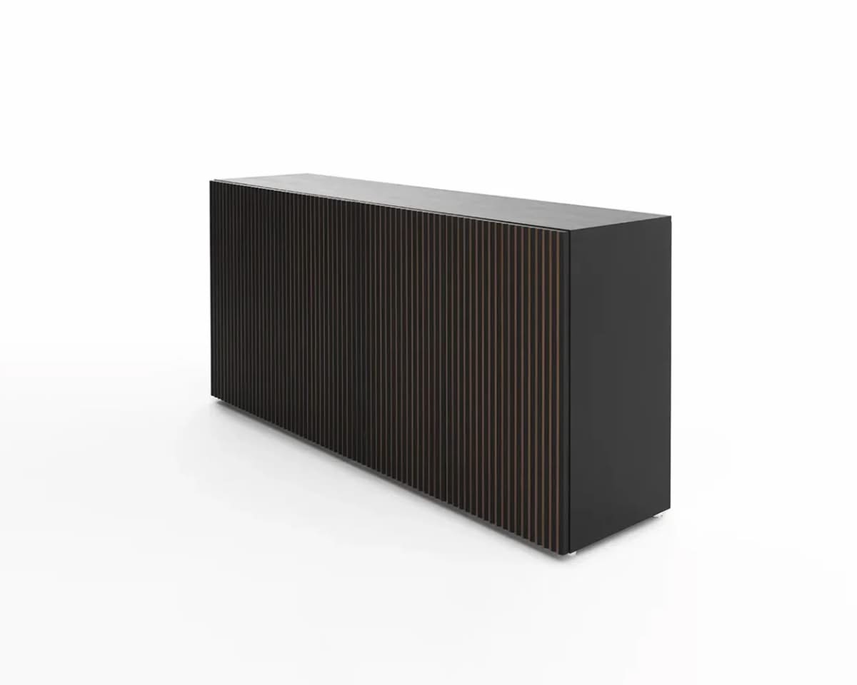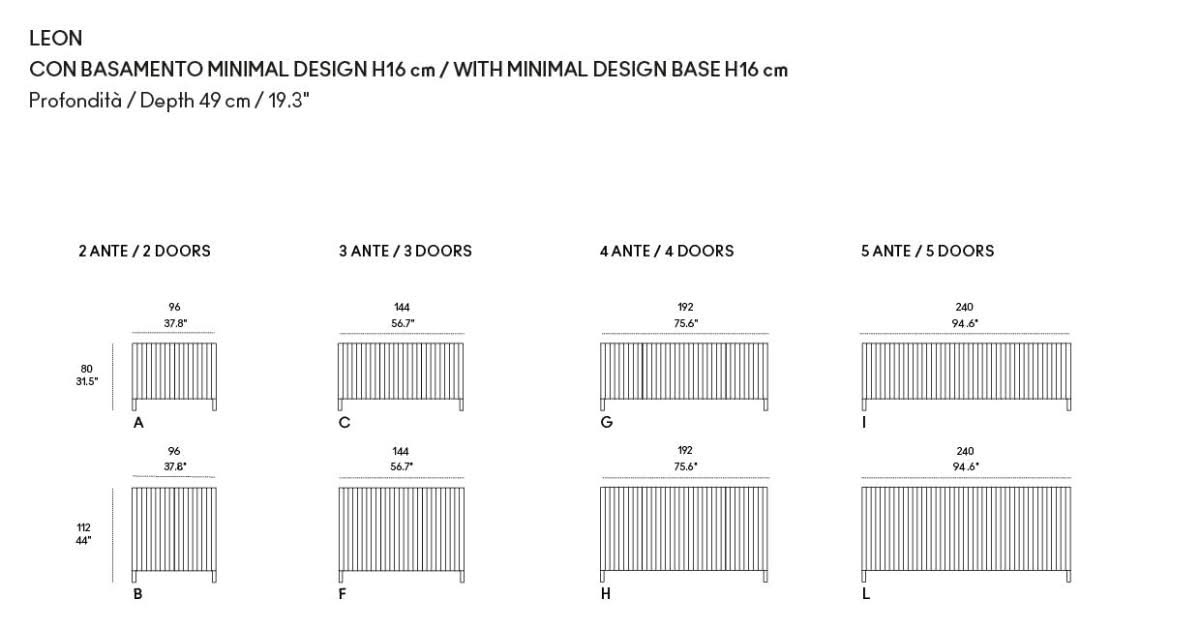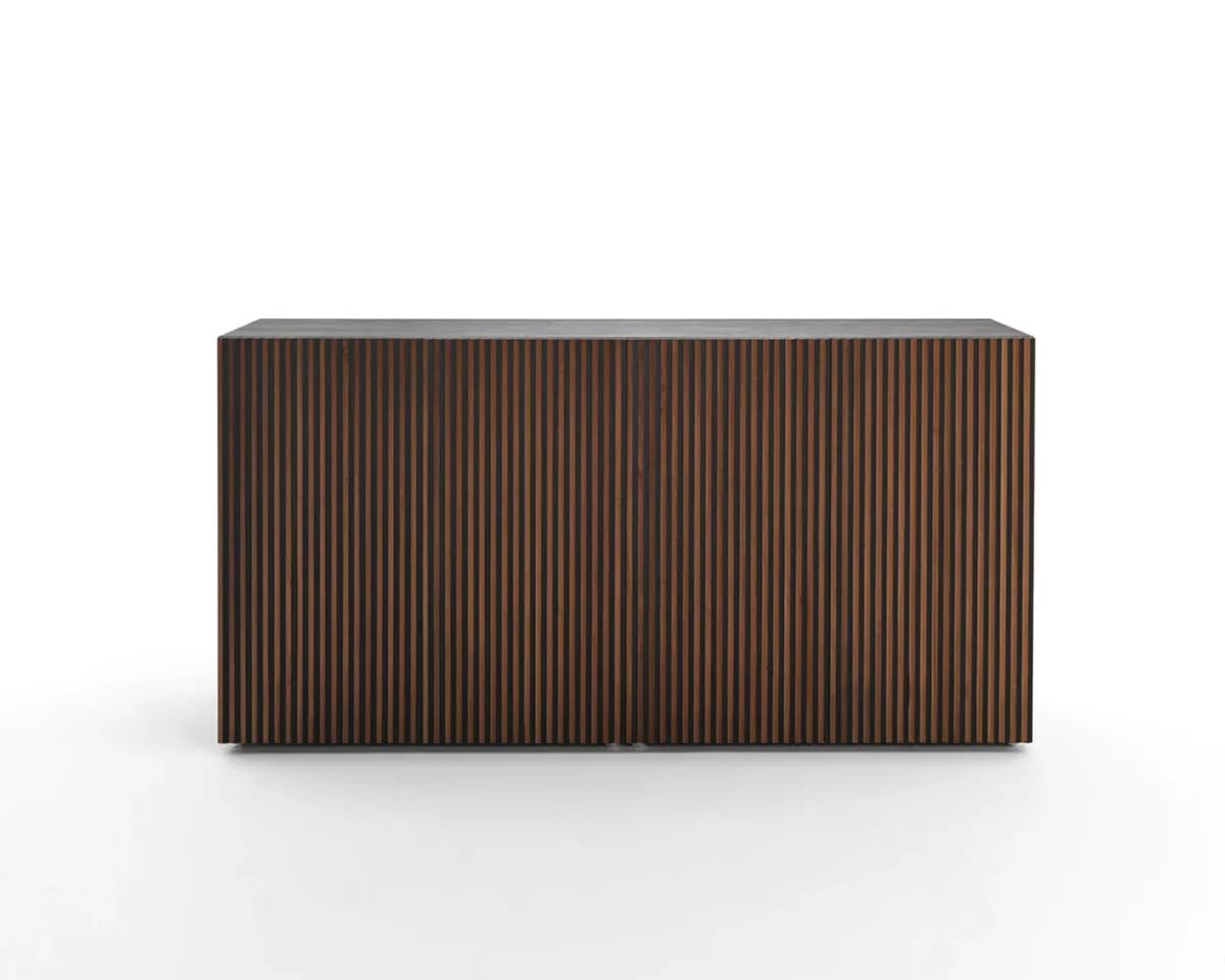 Leon Wood Moca Madia di Horm è il mobile contenitore di design con struttura e ante in pannelli di particelle di legno o in MDF impiallacciati e tinti. Inserti a sezione triangolare in legno massello di faggio tinto. Ripiani interni in vetro temperato. Leon Wood Minimal Design celebra l'essenzialità della forma e della materia. Il ritmo verticale del legno diventa un gioco di luci e ombre, arricchito dalla texture e dalle venature naturali della superficie. La base Minimal Design riduce il peso visivo della struttura, enfatizzandone le linee pure e il carattere architettonico. Elegante, caldo e discreto, Leon Wood Minimal Design si inserisce con naturalezza in interni raffinati, dove la bellezza risiede nella semplicità e nelle proporzioni.