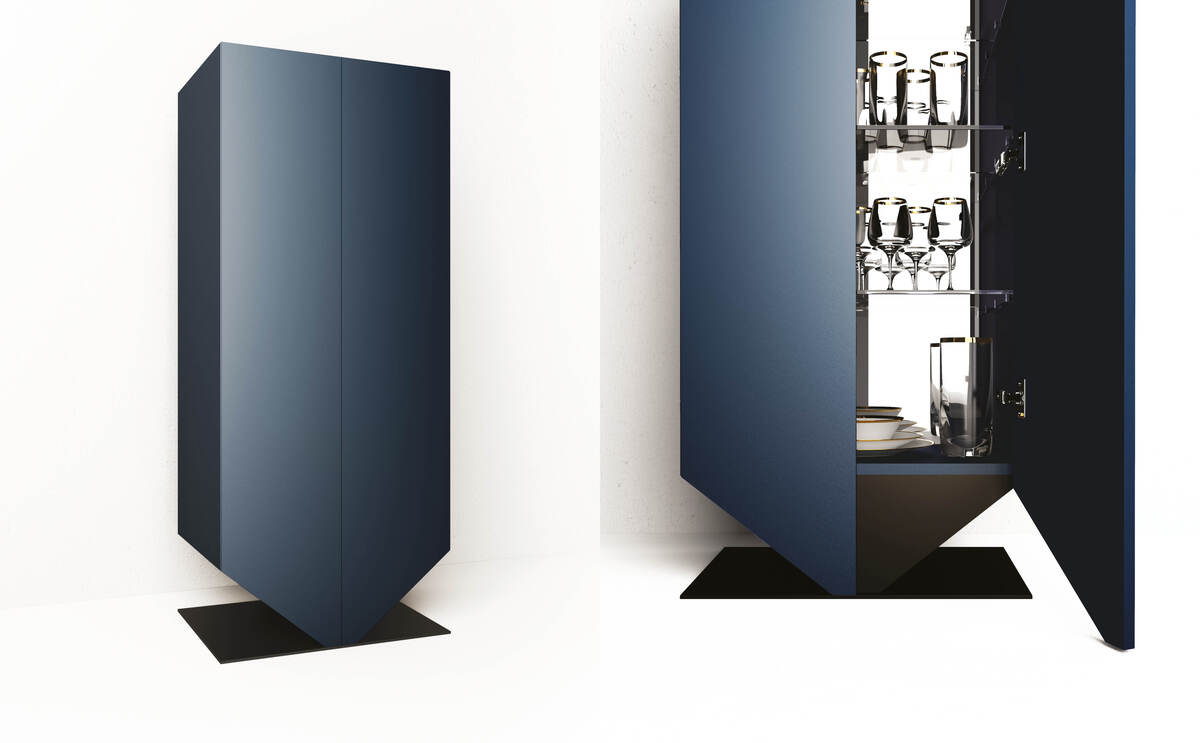 Timpano Madia è il mobile contenitore in agglomerato di legno con 2 ante sagomate, lavorazione a 45° sui 4 lati, tre ripiani spostabili in cristallo extra - chiaro, schienale interno a specchio. Contenitore in finitura goffrata nei colori a campionario, base in metallo colore antracite in finitura goffrata.