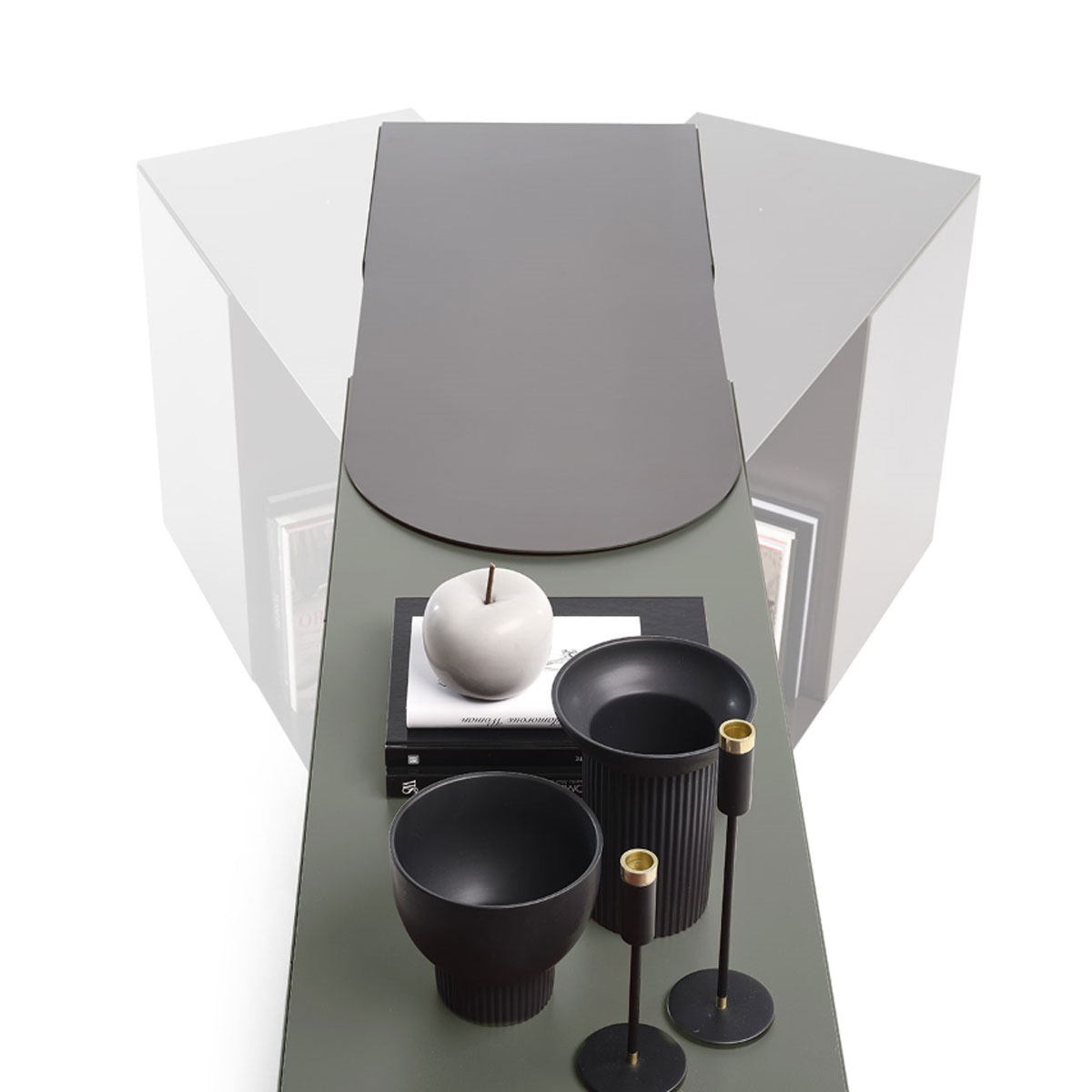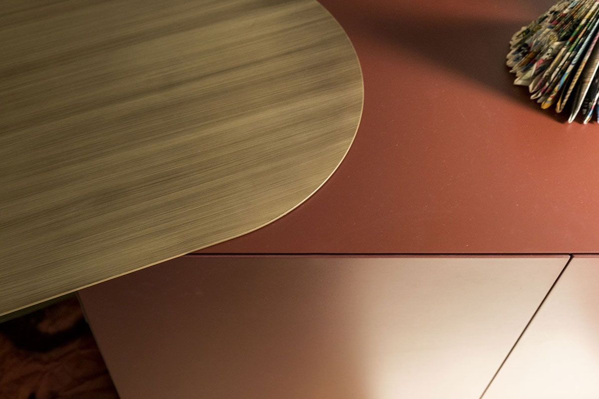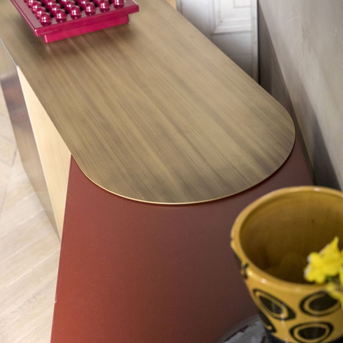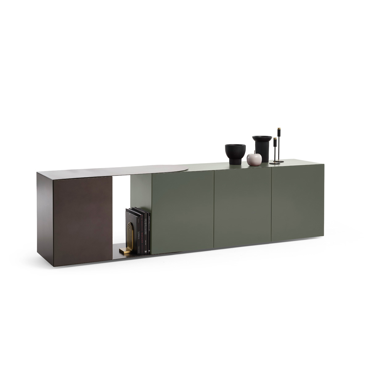 Partout Credenza by Mogg è il mobile contenitore di design a credenza con struttura in MDF ed elemento orientabile in metallo, completa di 4 ante e 3 ripiani interni in cristallo. Disponibile laccata goffrata in tutti i colori RAL da campionario oppure placcata in legno di eucalipto termotrattato su richiesta. L’elemento orientabile in metallo è disponibile brunito oppure bronzo patinato.