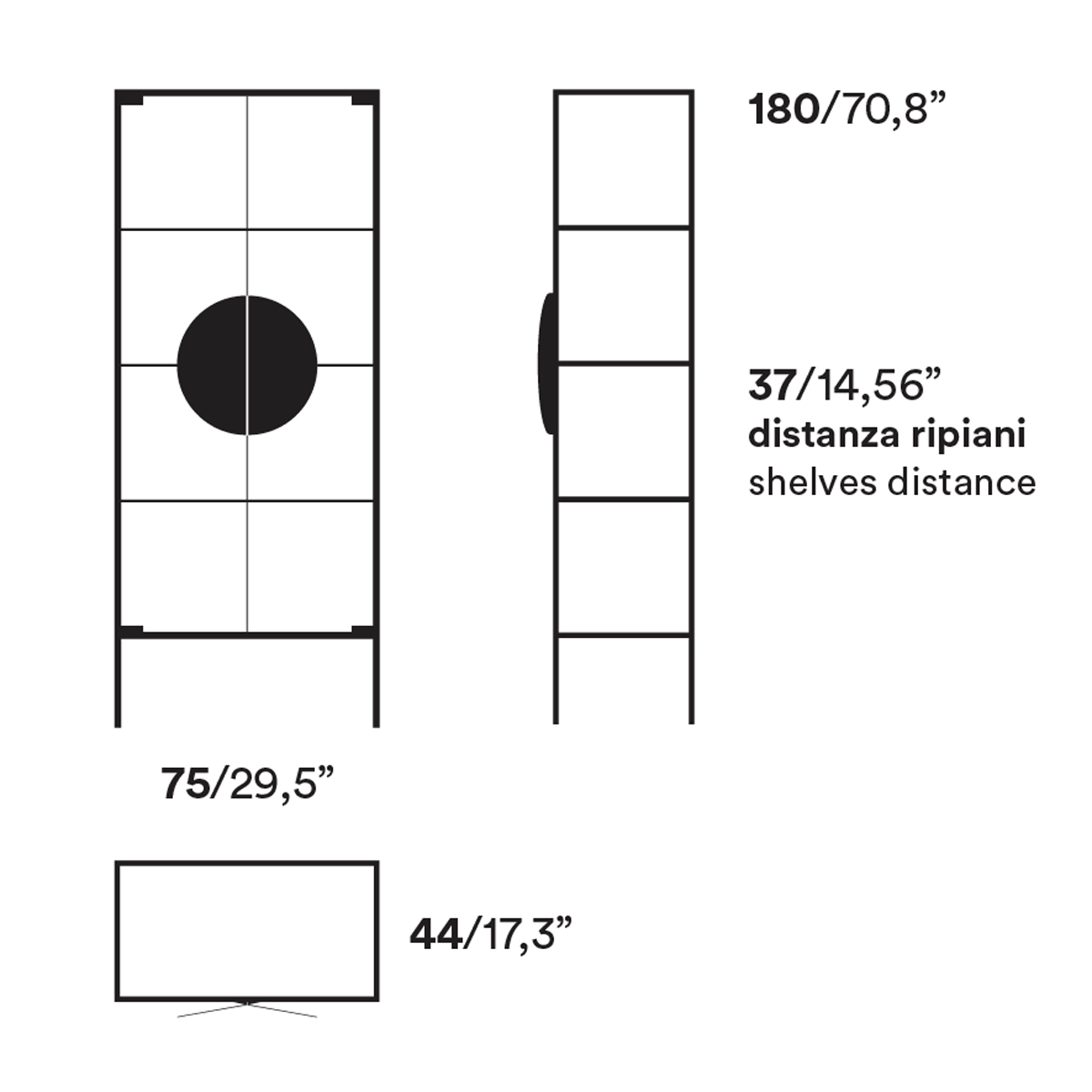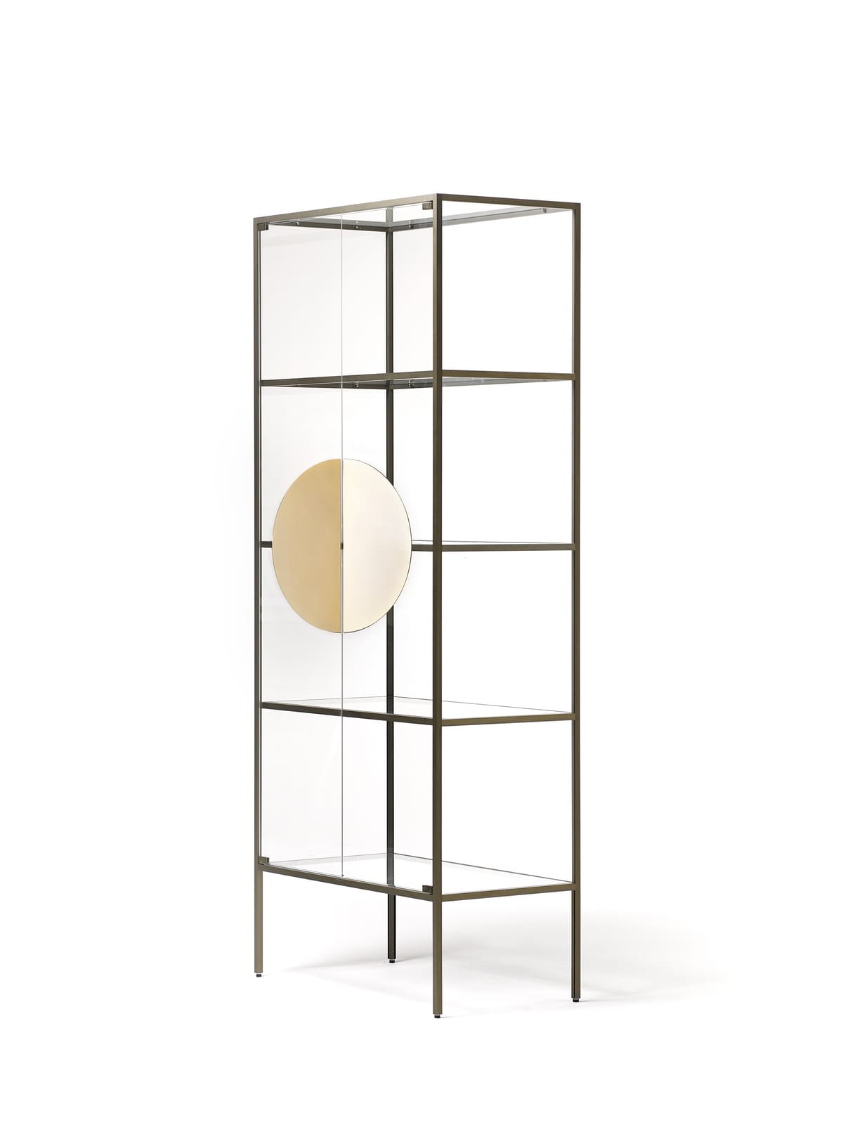 Yang Vetrina contenitore è il mobile contenitore di design in vetro temperato con grande maniglia decorativa. Struttura in alluminio anodizzato. Due ante, quattro ripiani in vetro coordinati con la finitura. Finiture: struttura con finitura nera opaca, maniglia in finitura nickel nero e vetro fumé; struttura con finitura ottone brunito satinato, maniglia in finitura oro 24 K e vetro trasparente. Yang, la vetrina scultorea di Marta Giardini, si ispira all’antica filosofia taoista e reinterpreta in chiave contemporanea l’archetipo dell’armadio cinese. Yin e yang, “il lato in ombra della collina" (yin) e il lato soleggiato della collina (yang). La notte che si tramuta in giorno, il giorno che si tramuta in notte. L’interno e l’esterno. Perché ogni cosa ha radice nel suo opposto e nessuna cosa può esistere senza la sua metà. Così Yang, il contenitore presentato al Salone del Mobile 2018, preserva e lascia ammirare, accoglie ed espone allo stesso tempo. Una struttura esile ed elegante in alluminio anodizzato, ricoperta da resistente cristallo, lascia spazio ad una totale trasparenza, ad un continuo scambio tra ciò che sta dentro con ciò che sta fuori. Un telaio discreto e funzionale a cui fa da contraltare, al centro, la grande maniglia scultorea in metallo. Le finiture della struttura sono morbide e satinate mentre la maniglia risplende come un gioiello grazie all’oro o al nichel nero di cui è ricoperta. Un grande cerchio che attira l’attenzione e che invita a guardare quanto è protetto ed esibito allo stesso tempo. Un pezzo dalle mille ed imprevedibili personalità: sarà il dialogo tra contenuto e contenitore – yin e yang – a definirle. Un pezzo estremamente versatile, adatto ad essere ospitato in spazi pubblici e privati che, grazie anche alle due finiture in cui è realizzato - nero o ottone brunito - ben si sposa con i contesti più disparati, siano essi classici, minimal o d’ispirazione industrial.