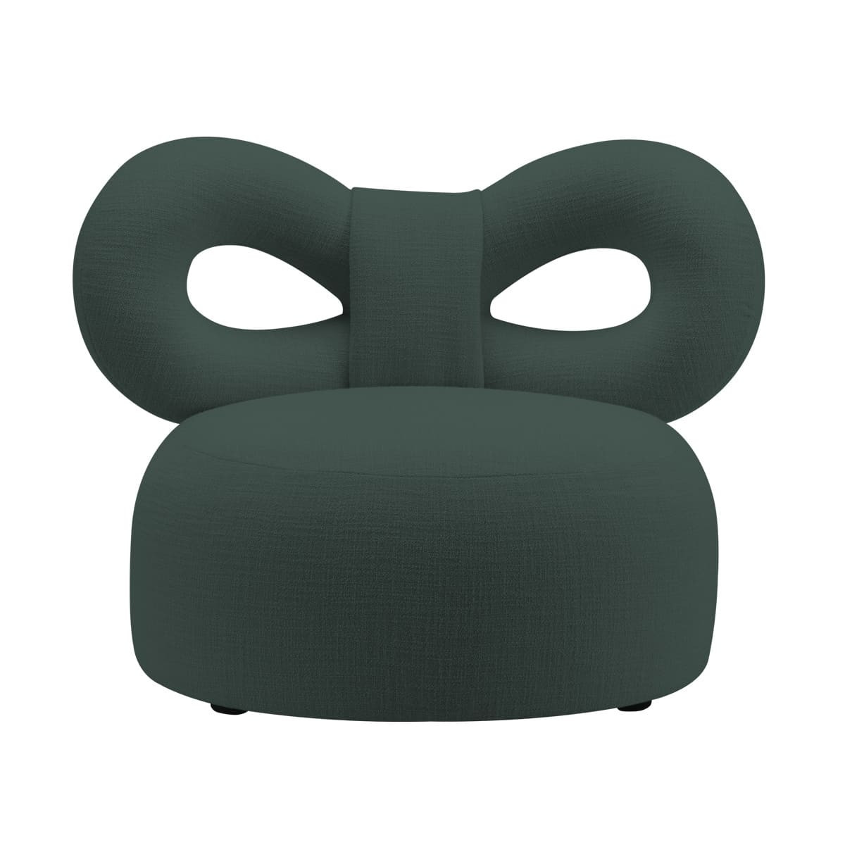 Ribbon Poltrona Tessuto C petrolio di Qeeboo è la poltrona di design dall'originale schienale a nastro dal forte appeal femminile, una comoda seduta realizzata in poliuretano espanso rivestito in tessuto per favorire il relax, evocando un mondo straordinariamente romantico. Rivestita in tessuto Dedar, disponibile in sei diverse varianti di colore e qui proposta nella versione verde scuro petrolio.