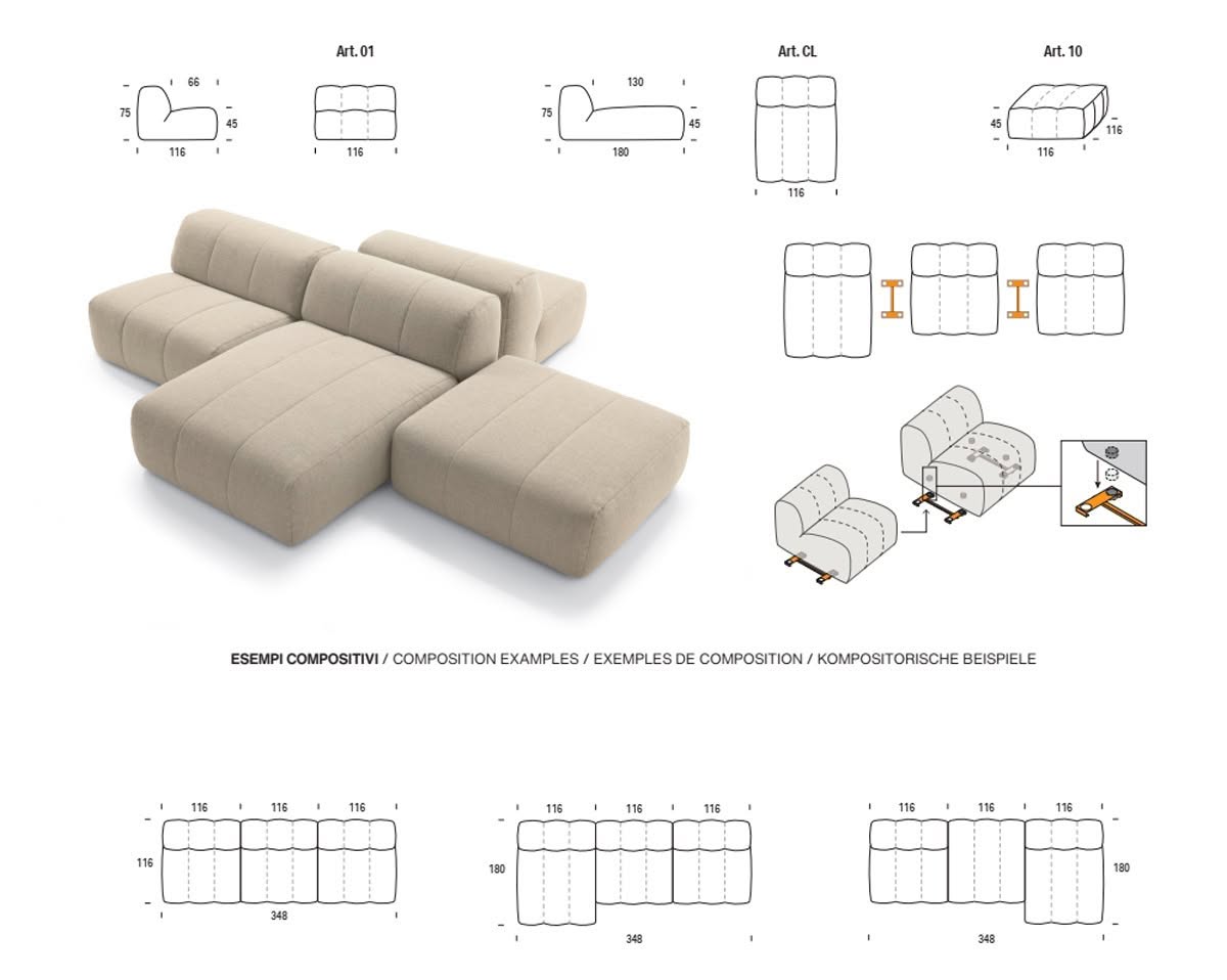 Muffin Pouf Felis è il pouf di design per dare forma a mille composizioni, mille storie diverse da raccontare. Sempre però a lieto fine: grazie alla dolce morbidezza delle sue forme, nelle quali immergersi e lasciarsi coccolare, con Muffin “vissero tutti felici e contenti”. Ogni elemento del programma Muffin è pensato anche per essere indipendente. Come la comoda e versatile poltroncina, perfetta per ogni ambiente. Combinando a piacere i tre moduli, è possibile dare vita al proprio divano ideale, con profondità di seduta diverse e configurazioni che vanno dalla più classica alla più creativa. Difficile rinunciare alla comodità di distendersi su una soffice chaise longue. Tutti gli elementi sono uniti tra loro tramite un pratico sistema di aggancio a staffe brevettato da Felis. Lo stile di Muffin è definito dall’elegante trapuntatura, dal taglio obliquo che unisce in un tutt’uno seduta e schienale e dai volumi morbidi ed essenziali, che rendono superfluo persino il bracciolo.