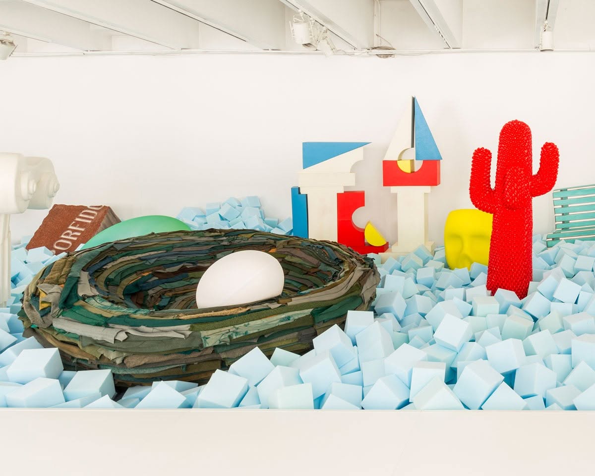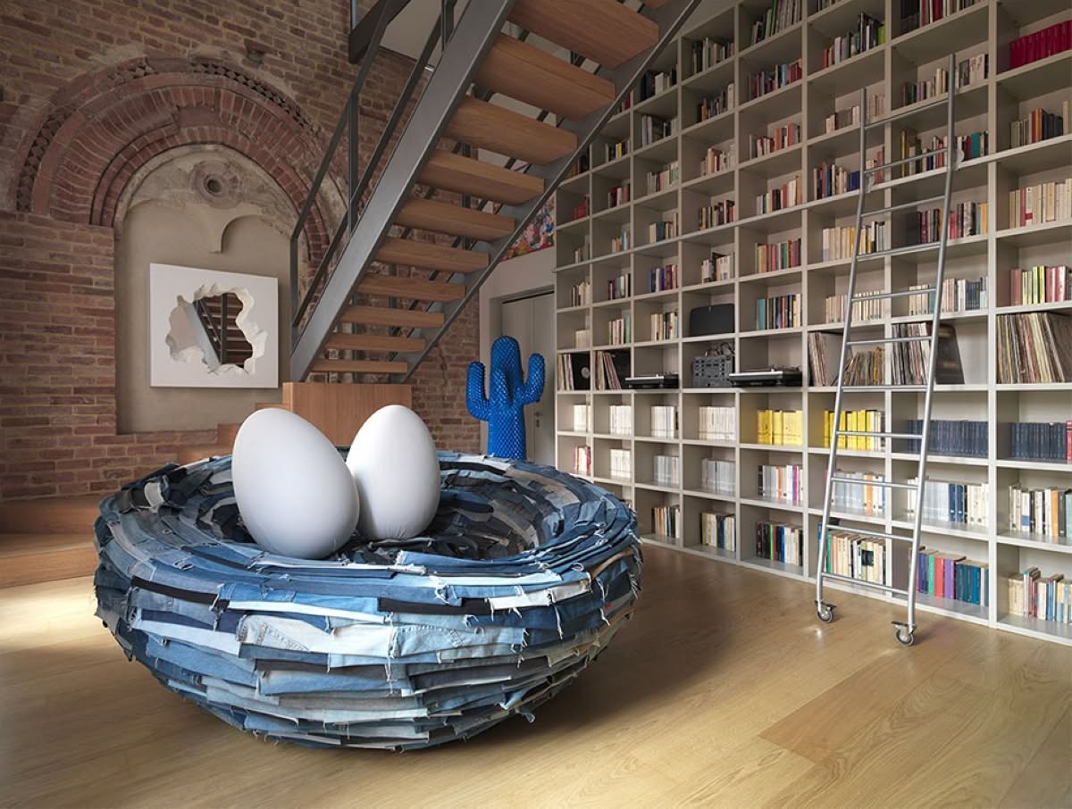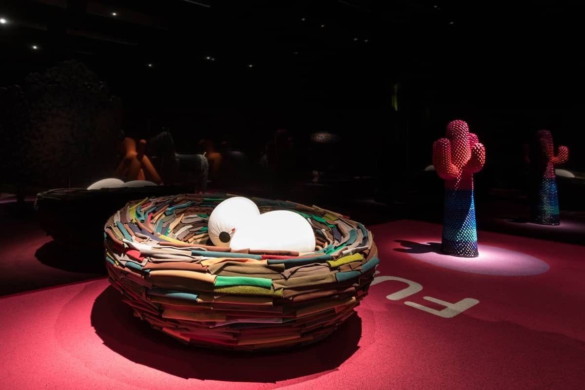 Gufram La Cova Nido d'amore | Nido d'amore in morbido poliuretano rivestito con ritagli di stoffa cuciti a mano. Uova removibili in morbido poliuretano con rivestimento sfoderabile in tessuto Limited Edition 1/38
