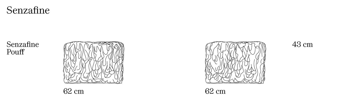 Meritalia Senzafine Pouf è la pouf di design dai grovigli colorati che danno vita a una seduta geometrica e dinamica. Una serie di sedute gioiosamente incoerenti disegnate da Gaetano Pesce, manifesto dell’identità pop-moderna di Meritalia. Per Meritalia®, la ricerca di nuovi linguaggi e lo sviluppo di nuove tecniche sono processi continui, le cui direzioni si intrecciano e accavallano senza fine. Senza fine è anche la volontà di progredire, di inventarsi il futuro e adattarlo a nuovi gusti, desideri, stili di vita. Gaetano Pesce omaggia l’approccio di Meritalia® e chiama Senzafine una serie di sedute irripetibili. Ogni pezzo della serie è originato dall’estrusione in continuo di un cordolo di poliuretano che l'artigiano aggroviglia, in modo arbitrario e quasi espressionista, formando anse morbide e forme organiche, dando vita a sedute uniche. L’estro artistico del fatto a mano incontra la precisione del progetto: gli stampi geometrici domano i filamenti di poliuretano e li trasforma in un solido monolite, una seduta durevole, versatile, adatta all’esterno come all’interno, e mai uguale. Senzafine è disponibile in diverse colorazioni sature e brillanti, che ben manifestano l’identità pop-moderna e non-coerente delle produzioni Meritalia®. Evoluzione sofisticata di un progetto iniziato nel 1996, la serie manifesta la lungimirante volontà di Pesce e Meritalia® di muoversi verso territori inesplorati, radicali perché noncuranti della stagionalità, senza fine e senza tempo.