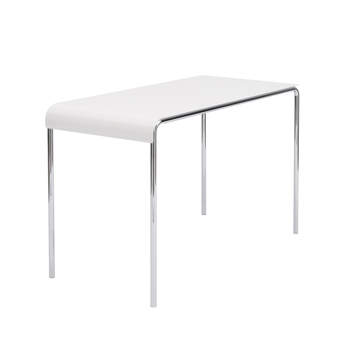 Farallon Desk Scrittoio by Yves Behar per Danese Milano è un tavolo di design dal profilo leggerissimo ma resistente. Il principio strutturale riprende forme e tecnologie della linea Farallon, una sottile superficie metallica armoniosamente piegata che asseconda le sagome delle superfici morbide. Le gambe sono in metallo verniciato bianco, il piano è bianco.