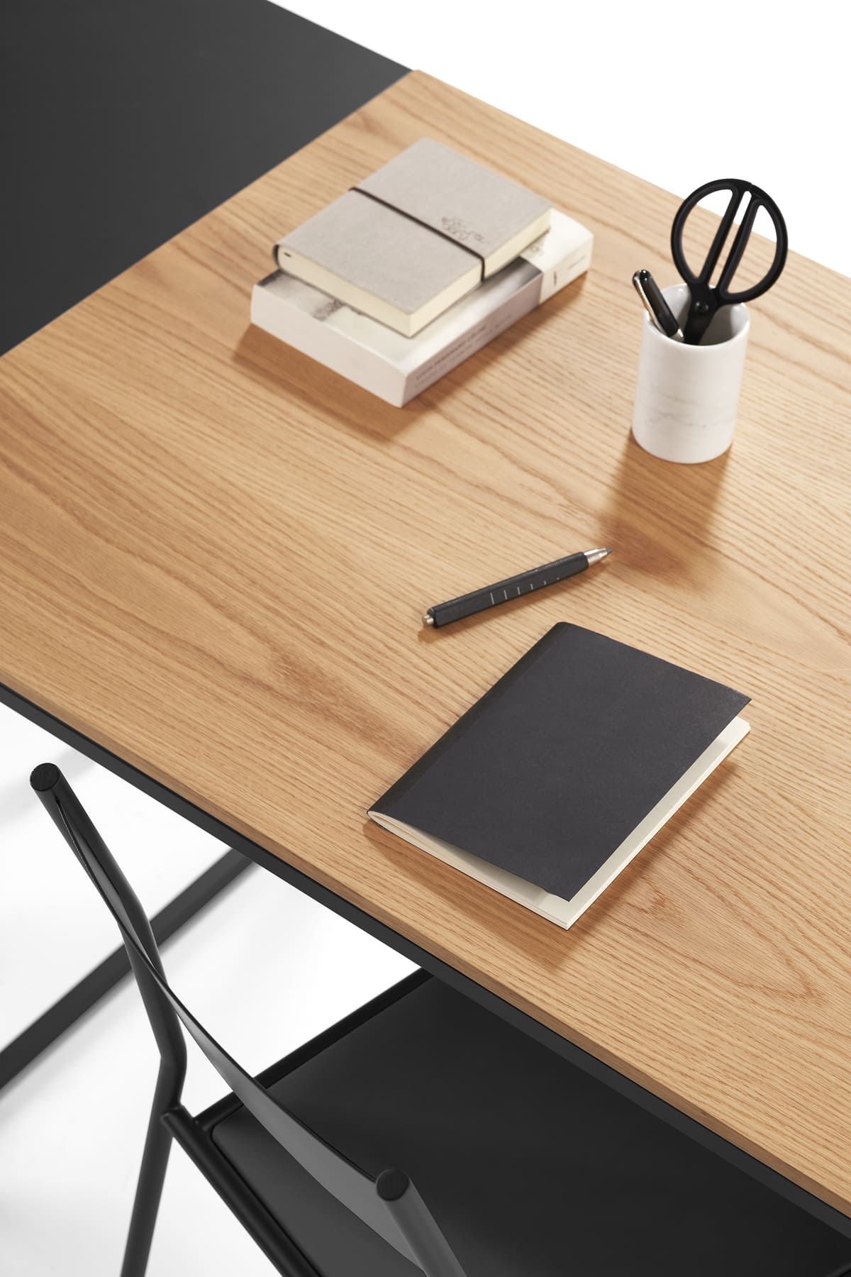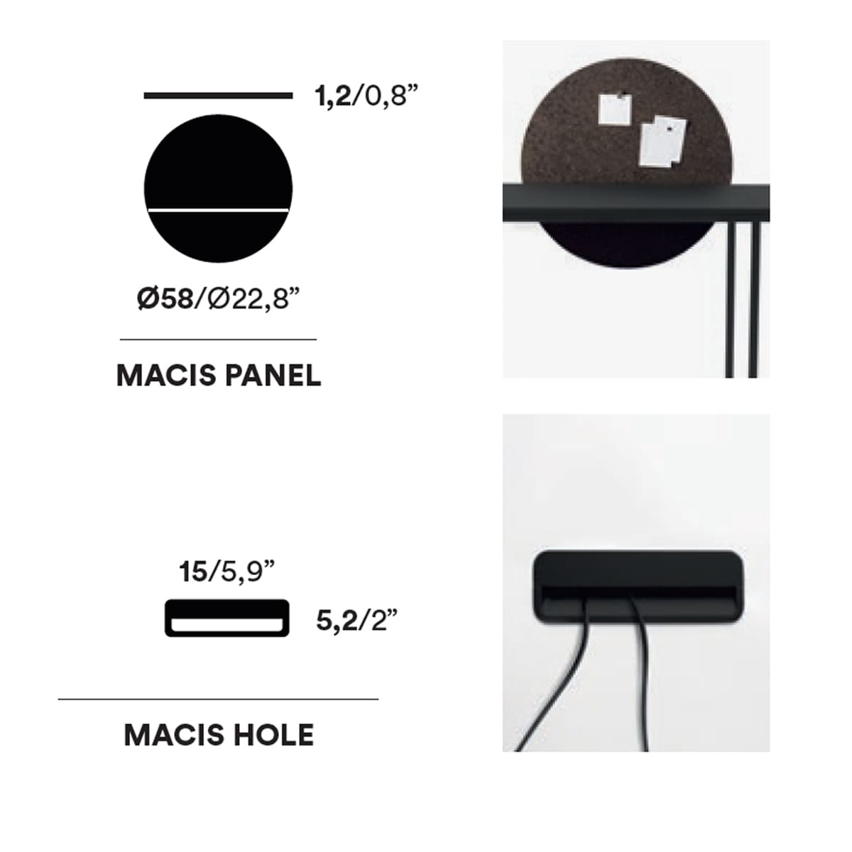 Macis Tavolo-Scrivania è la scrivania di design con struttura in acciaio e piano sottile in PET o legno. Facilmente spostabile grazie a un rullo in alluminio con due o-ring neri salva graffio. Allungabile. Finiture struttura: nero opaco. Finiture piano: PET nero o bianco opachi. Legno impiallacciato rovere chiaro con protettivo trasparente opaco. Accessori: prolunghe con piani in PET nei colori nero o bianco opachi. Cassetto sottopiano con struttura nera e frontale coordinato con il piano, posizionabile nei quattro angoli. Pannello circolare per appunti in sughero bruno e acciaio, posizionabile a destra o a sinistra. Passacavi rettangolare in alluminio nero. Tavolo o scrivania? Piano di appoggio, postazione lavoro, angolo studio, luogo di svago spazio per la condivisione. Il vivere quotidiano ci pone davanti a molteplici sollecitazioni, Macis si offre come soluzione unica e trasversale. Viviamo in un mondo dai confini liquidi, labili, sempre più sfumati. Cambiano le abitudini, si fanno strada nuovi bisogni, la capacità di adattamento appare come una necessità. Macis, il tavolo/scrittoio di Lapo Ciatti, nasce come risposta alle rapide trasformazioni del nostro tempo. Con un design pulito e ricercato - un’esile struttura in acciaio sormontata da un sottile piano in legno o PET –, Macis è pronto a fondersi, anche grazie alle diverse combinazioni di finiture disponibili, con l’ambiente circostante. Non senza aver lasciato il suo sentore caldo e inconfondibile. Un tavolo “agile” che si sposta, si allunga, contiene e si trasforma. Un rullo lo aiuta a prendere posto esattamente là dove serve. A casa per sancire la fine della giornata lavorativa e l’inizio di quella personale; negli uffici, negli istituti scolastici, negli studi professionali, negli spazi di co working, ovunque ci sia bisogno di ridisegnare la geometria delle stanze e misurare le distanze. Le prolunghe di cui può essere dotato lo rendono invece allungabile, quando progetti e idee hanno bisogno di più centimetri per essere condivise. Un cassetto sottopiano è un aiuto per tenere tutto in ordine, mentre un pannello circolare in sughero lo modifica nella forma ogni qual volta incontri o intuizioni meritano uno spazio per essere ricordati. Macis è stato selezionato per l'ADI Design Index 2021 e concorre così al Compasso d'Oro 2022.