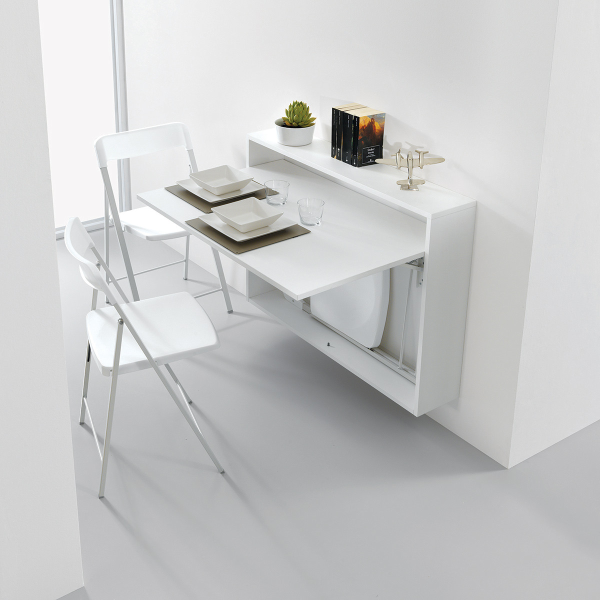 Bureau 0/87 Composizione 1 è il tavolo scrivania da parete con 3 sedie Zeta di Pezzani caratterizzato da un ingombro minimo chiuso (solo 20 cm di profondità) e realizzato in laminato Ecologico da 18 mm. Il vano interno può contenere fino a 3 sedie chiudibili Zeta (incluse nell'offerta) e può essere arricchita dalla libreria a muro 0/67 (opzionale) che ha la stessa larghezza e profondità. Può essere utilizzato come tavolo di servizio, scrivania, ed ogni altra necessità di appoggio temporaneo. Le 2 staffe in acciaio chiudibili che sostengono il ripiano sono molto robuste e funzionali, e consentono una portata di 20 kg. Sollevando il ripiano si bloccano automaticamente in posizione aperto e schiacciando contemporaneamente i 2 pulsanti, si sbloccano facilmente per chiudere il ripiano.