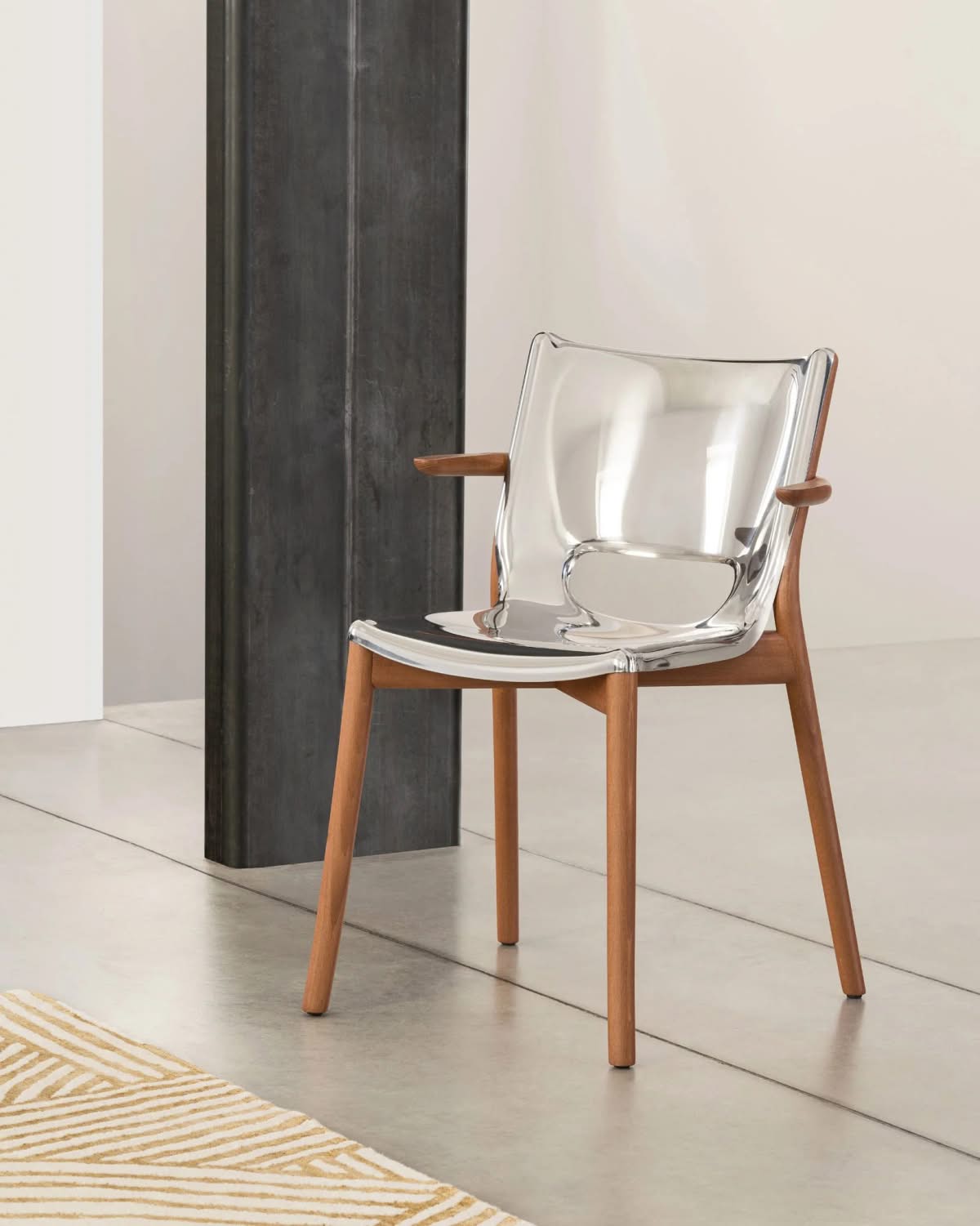 Alessi PS20 Poele Chair Sedia con braccioli acciaio lucido Philippe Starck | Sedia monoscocca in acciaio inossidabile 18/10 lucido. Struttura e braccioli in legno di faggio tinta bruna