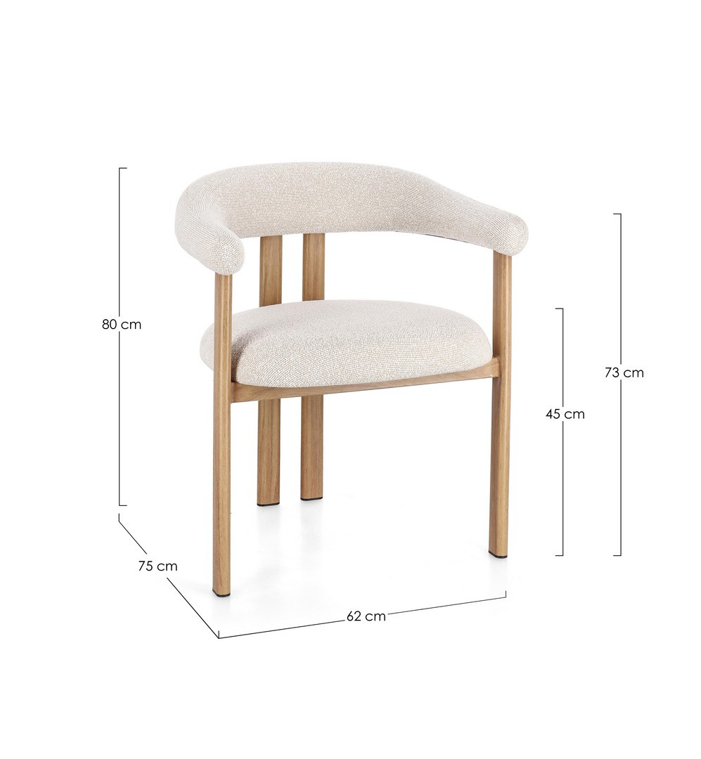 Sedia con braccioli Giuditta Naturale-Lino di Bizzotto è la sedia di design con struttura in acciaio verniciato a polvere epossidica. Seduta e schienale con rivestimento in poliestere, effetto boucle'. Densita' imbottitura in schiuma poliuretanica seduta 24-28kg/m3, schienale 22-24kg/m3.
