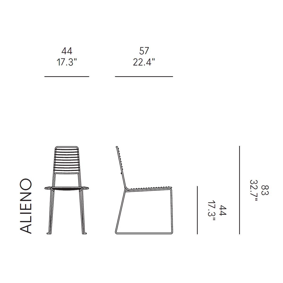 Alieno sedia di Casamania è una sedia di design realizzata in tondino di metallo verniciato per l'esterno. Il vocabolo “alieno” deriva da “alius” che significa “altro”. L’accezione della parola dipende però dal contesto a cui fa riferimento. Interessante è riuscire a dare un risvolto amichevole a questa polisemanticità, invitando ad accogliere “l’altro” e quindi “l’alieno”. Alieno è anche disponibile in una versione lounge (Alieno Peacock) e in una versione con schienale alto (Alieno High). La semplicità di queste forme le rende immediatamente riconoscibili e comprensibili trasmettendo a ciascuno nuove storie dai connotati fantastici e immaginari.
