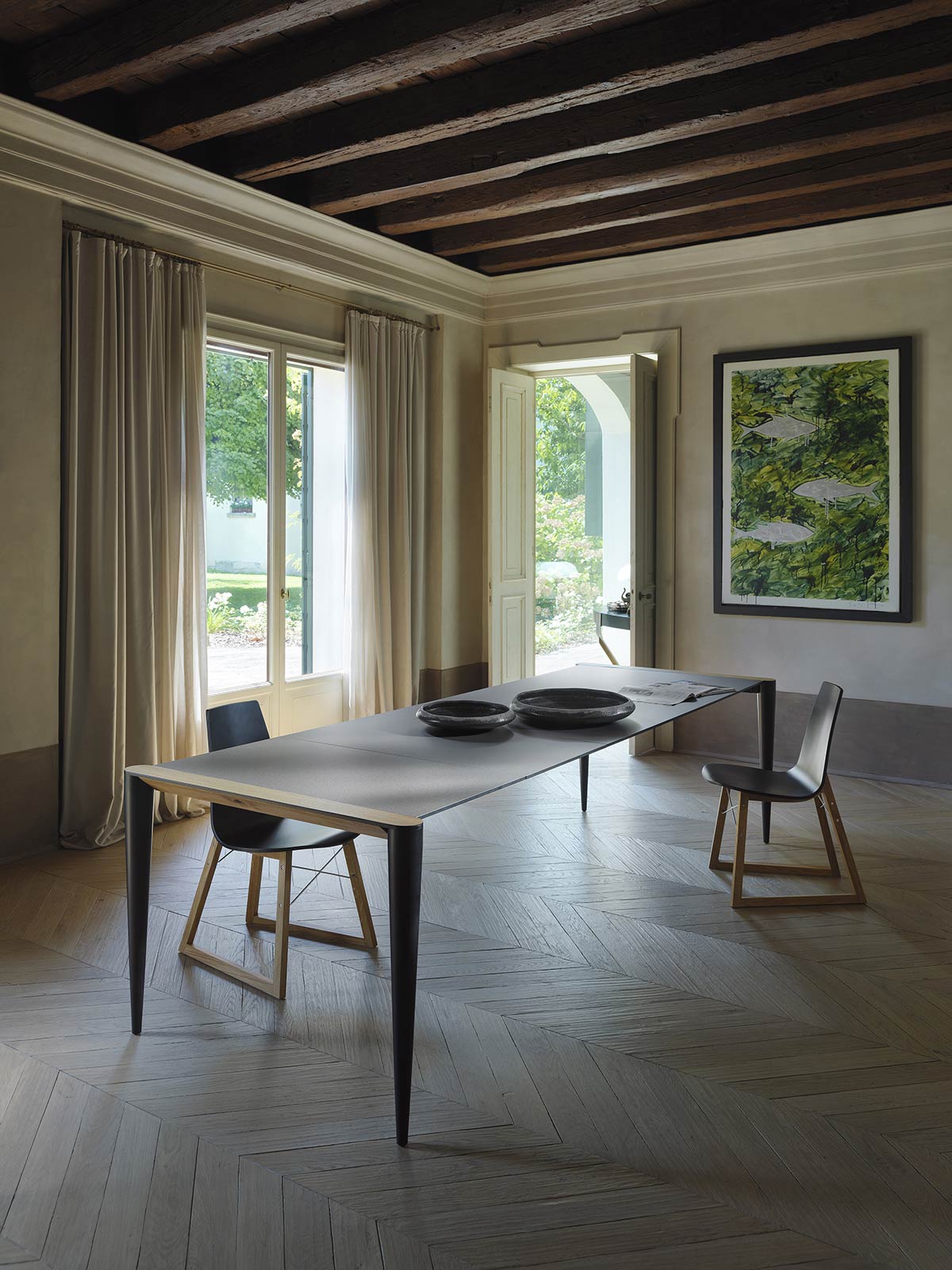 Gambe a slitta in legno massello. Seduta e schienale in multistrato di faggio laccato opaco