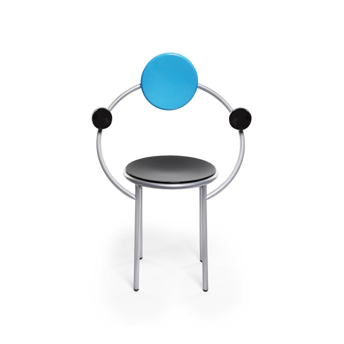 Memphis Milano First Sedia di Michele De Lucchi è una sedia di design in legno laccato, struttura in metallo verniciato. Con First, Michele De Lucchi sembra omaggiare Alexander Calder nella leggerezza e nella mobilità delle forme. L'opera, simbolo di Memphis, è stata pensata per essere assemblata e replicata facilmente: fabbricata in piccola serie, reinterpreta in stile Memphis il perfetto connubio tra industria e artigianato. Si caratterizza per lo schienale blu con inclinazione adattabile e le due sfere nere che fanno da braccioli.