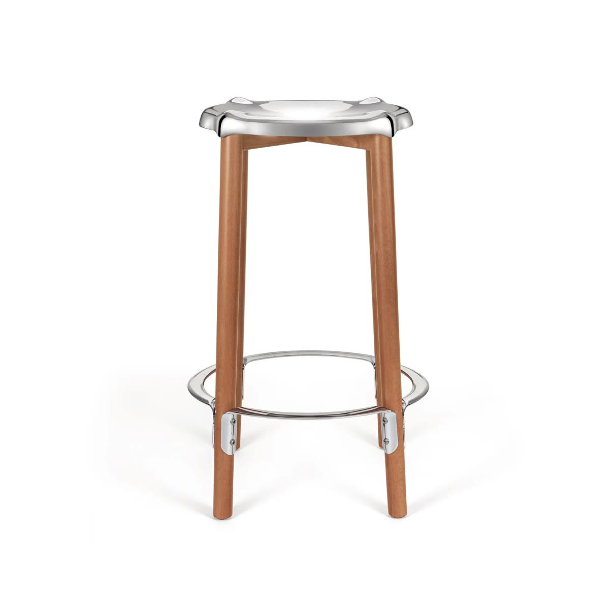 Alessi PS21 Poele High Stool Sgabello alto acciaio lucido Philippe Starck | Sgabello alto in acciaio inossidabile 18/10 lucido. Struttura in legno di faggio tinta bruna