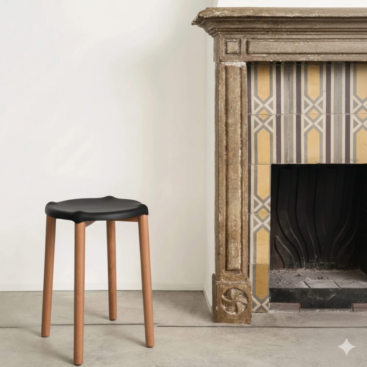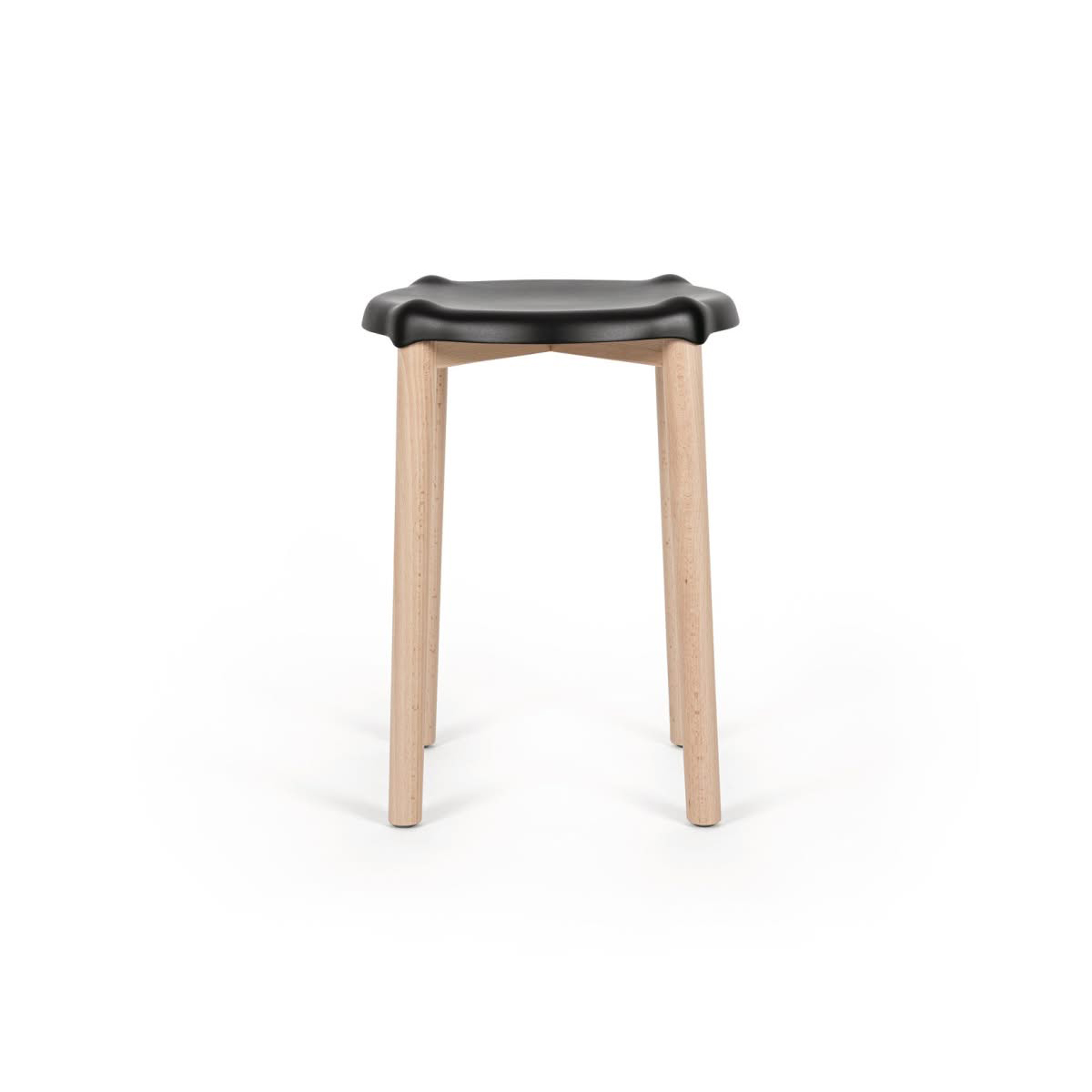 Alessi PS22 B Poele Low Stool Sgabello basso acciaio Nero Philippe Starck | Sgabello in acciaio colorato con resina epossidica, nero. Struttura in legno di faggio tinta naturale
