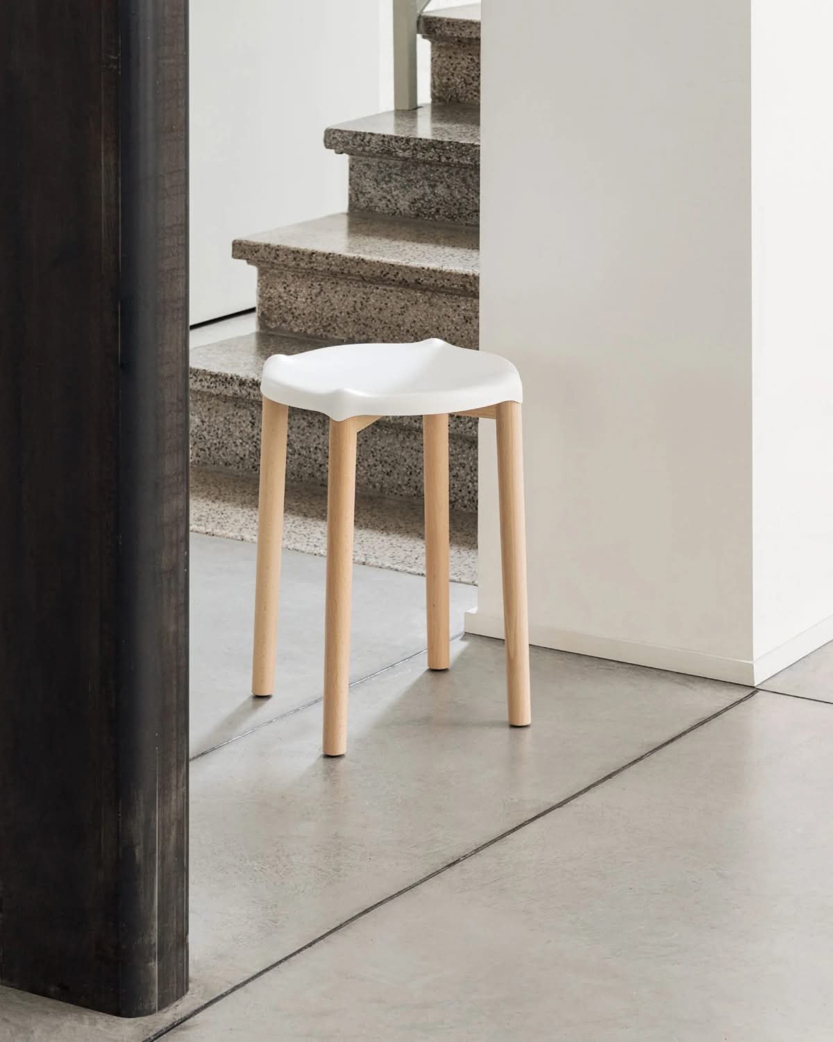 Alessi PS22 W Poele Low Stool Sgabello basso acciaio Bianco Philippe Starck | Sgabello in acciaio colorato con resina epossidica, bianco. Struttura in legno di faggio tinta naturale