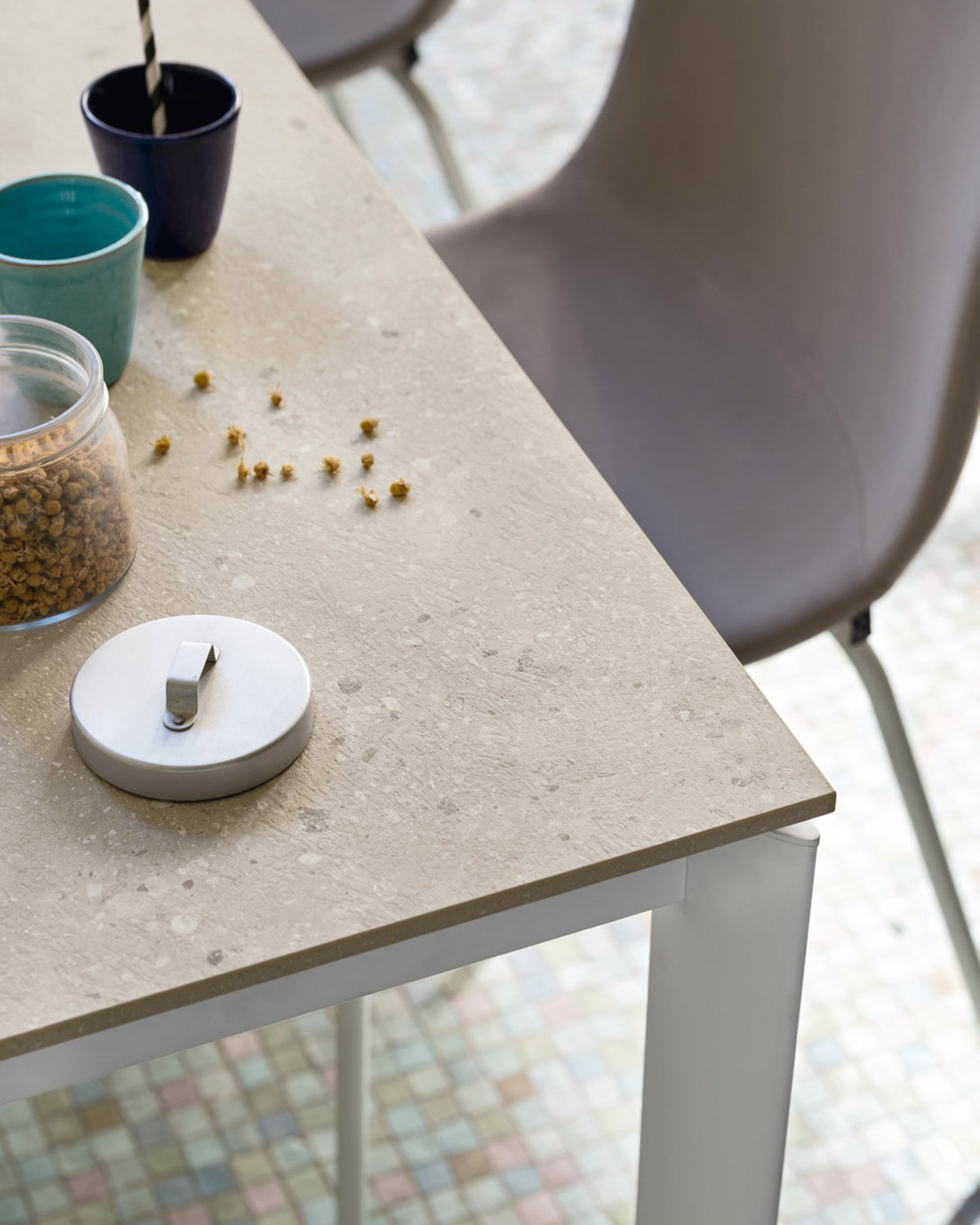 Il top ceramica-vetro è un prodotto autoportante ottenuto accoppiando, con uno speciale procedimento in autoclave, una lastra di ceramica (gres porcellanato) ad un vetro float temprato. Lo spessore della lastra di ceramica è di 3 mm, ed è accoppiata con un vetro di spessore 8 mm (totale 11 mm). Il gres porcellanato è un materiale ceramico ottenuto da materie prime di speciale pregio e purezza, macinate e colorate nell’impasto, compattate ad altissima pressione e cotte alla temperatura di 1200 °C. Il piano di lavoro in gres porcellanato offre caratteristiche eccezionali in termini di resistenza ai graffi, agli urti, alle macchie, agli sbalzi termici ed ai prodotti chimici. È facile da pulire ed assolutamente igienico in quanto non assorbe liquidi e non rilascia sostanze nocive.