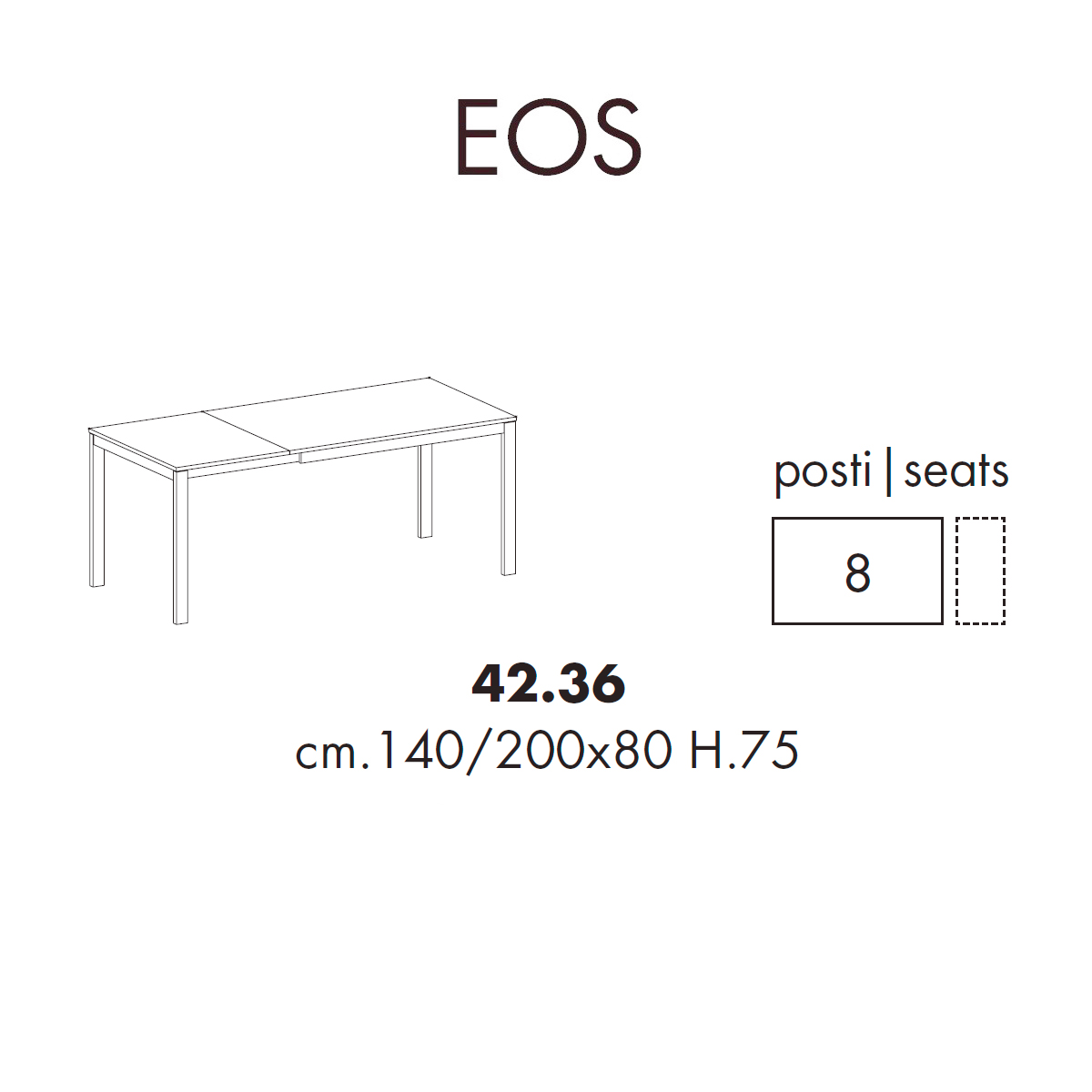 Il tavolo allungabile Eos 42.36 firmato Ingenia Casa presenta una singola allunga da cm. 60 che permette di estenderlo comodamente da 140 a 200 cm e di ospitare comodamente fino a 8 ospiti. Le gambe restando sempre perimetrali sui 4 lati evitano fastidiosi ingombri per gli ospiti garantendo sempre il massimo della funzionalità. Eos è caratterizzato da una solida struttura in acciaio verniciato mentre il piano è proposto in tante splendide finiture : melaminico, melaminico materico, unicolor antigraffio, cristallo laccato, cristallo velvet antigraffio e superceramica. Rigore e funzionalità rendono la prestazione la caratteristica fondamentale di tutti i tavoli della linea Eos, scegli la qualità, scegli il design made in Italy!