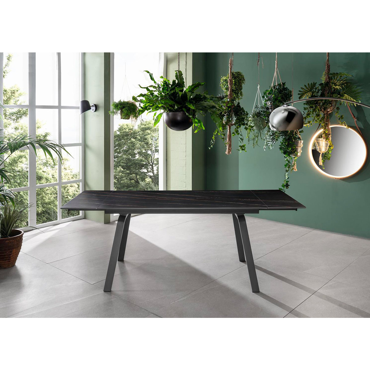 Dylan OM/404/MN è il raffinato tavolo allungabile firmato Stones proposto con struttura e gambe rastremate in metallo verniciato antracite e piano in pietra effetto marmo nero venato. Questo tavolo è dotato di un pratico meccanismo che permette di estendere le due allunghe laterali in pochi istanti, facendolo così passare il piano da 140 cm a 170 o 200 cm ed accogliere fino ad un massimo di 6/8 persone. Il piano e le allunghe sono coordinate è vengono proposte in pietra effetto marmo nero venato. Una proposta importante in grado di soddisfare i gusti più ricercati grazie anche alla capacità di adattarsi ad ogni esigenza di spazio e stili di arredamento.