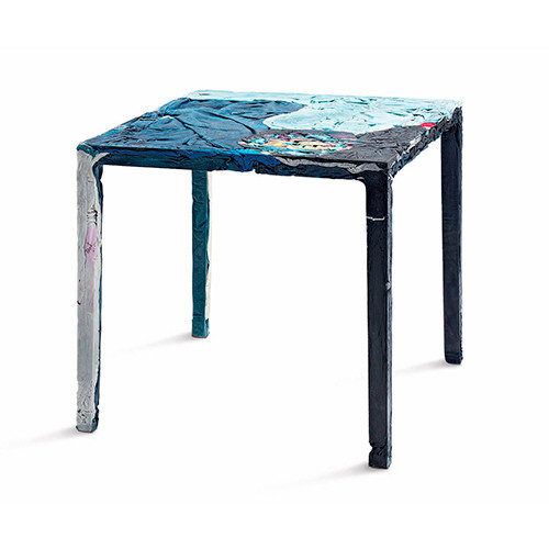 Tavolo realizzato a stampo, mescolando jeans, oppure jeans e t-shirt di cotone, ad una speciale resina indurente. Copri-top in vetro temperato extraclear spessore 6mm.