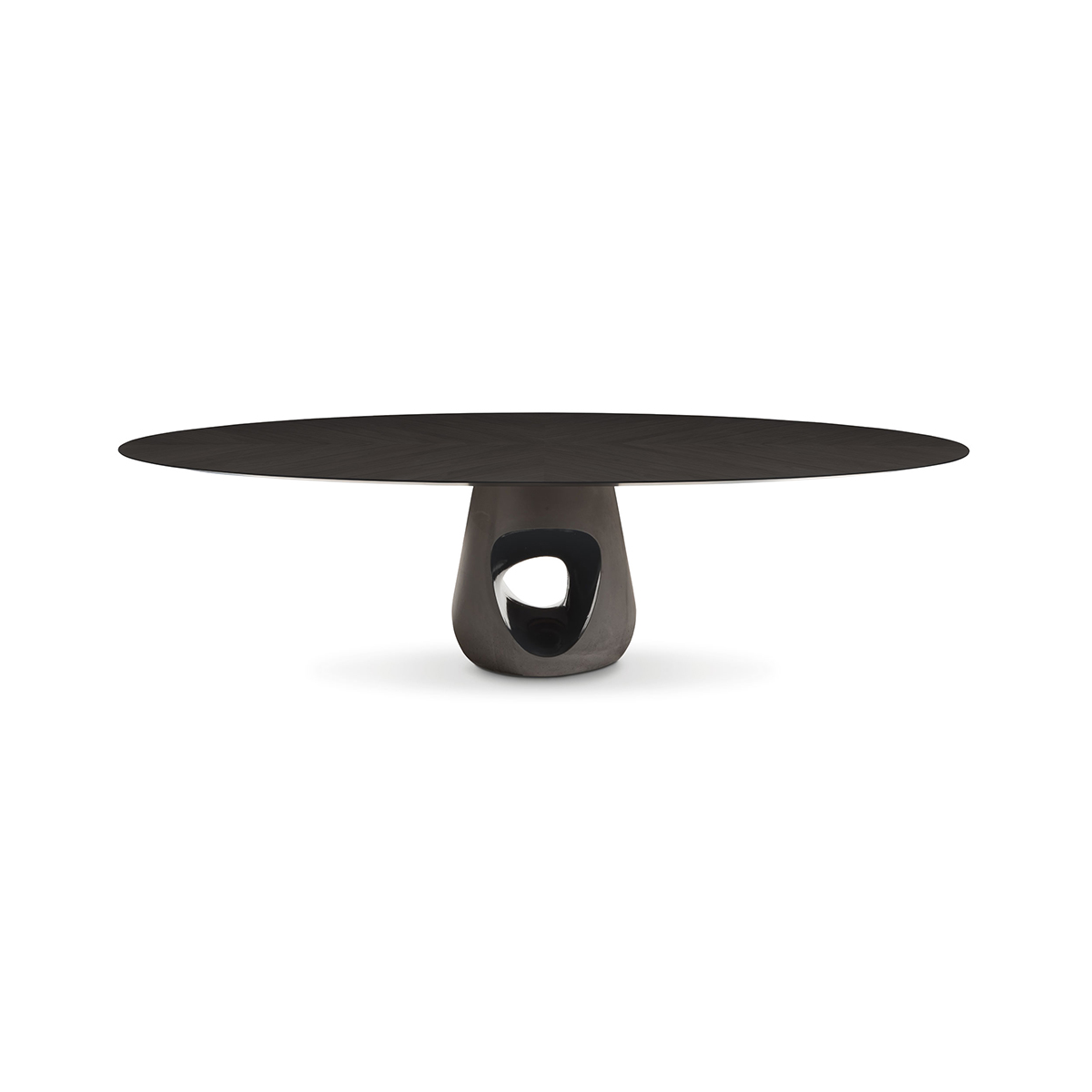 Barbara Tavolo in legno di Horm è il tavolo di design con top ovale o rotondo e con basamento centrale. Il prodotto trae libera ispirazione dalle opere della scultrice inglese Jocelyn Barbara Hepworth (1903-1975), e dal suo incessante studio sulla relazione tra l’uomo, l’ambiente naturale ed i materiali. La forma scultorea, le dimensioni generose e i materiali pregiati contribuiscono a dare al tavolo un aspetto lussuoso e contemporaneo, dall’indubbia personalità. Base in cemento colato in stampo. Sulla superficie esterna viene applicata una vernice protettiva trasparente, mentre la superficie del foro è verniciata nera. Il trattamento protettivo lascia volutamente visibili la naturale porosità del materiale, e la non omogeneità di colore. Il top è proposto in MDF impiallacciato rovere a doghe o noce canaletto a intarsio. Lazy Susan in Fenix nero.