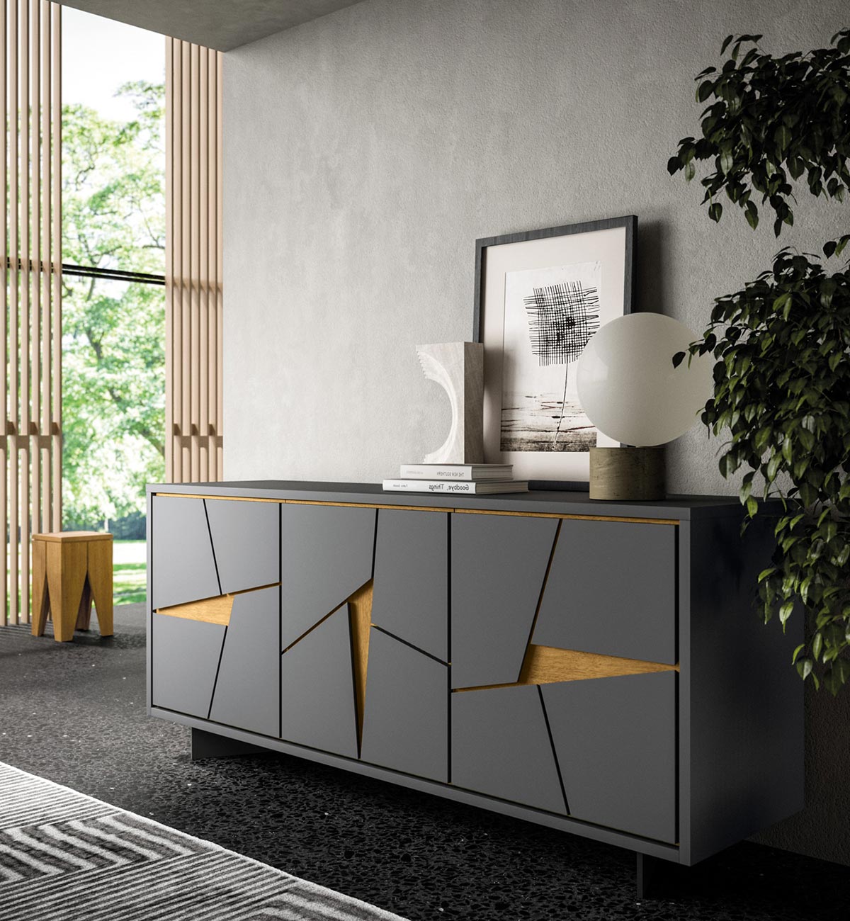 GROOVE: finitura definita Materica dove la piallatura, eseguita manualmente, è la sua principale caratteristica. Oltre alla piallatura a mano, troviamo segni di invecchiamento quali usura degli spigoli per sfregamento, tagli generati dal quotidiano utilizzo ed infine buchetti da finto tarlo. Il tutto è ricoperto da una patinatura scura che segna il tempo trascorso, donando un sapore Vintage a tutto il mobile.