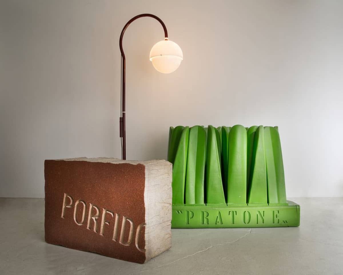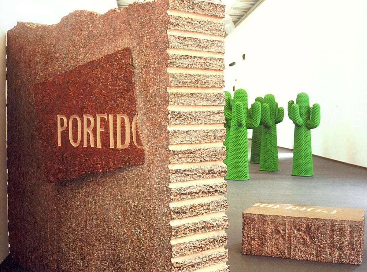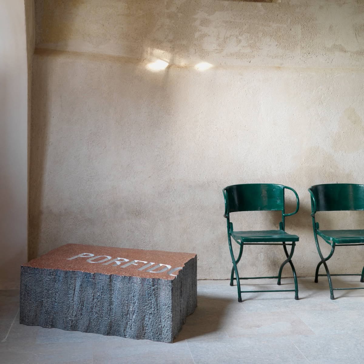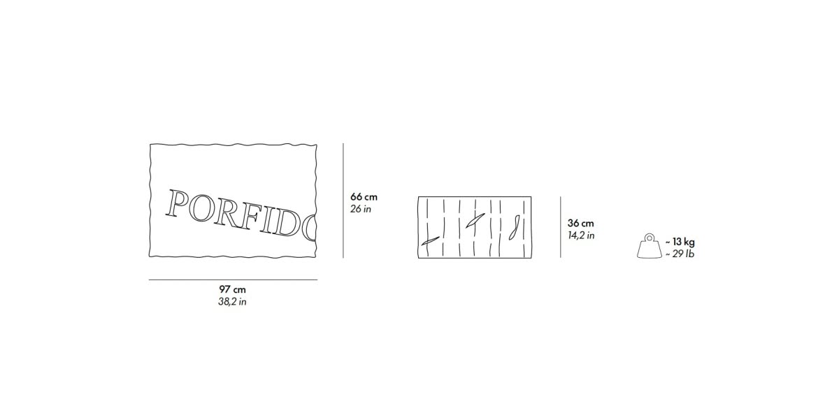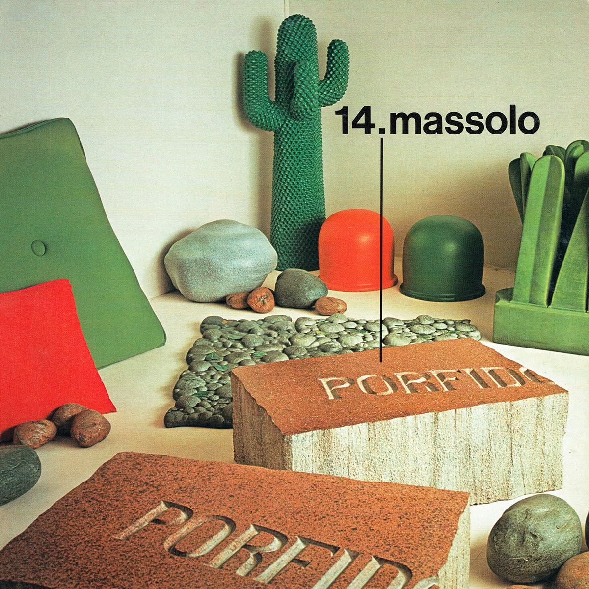 MASSOLO, straordinaria creazione di Gufram, si presenta come un’esperienza surreale e coinvolgente tra arte e design. Creando l'illusione di un pesante blocco di pietra con materiali inaspettatamente leggeri, questo pezzo, disegnato da Piero Gilardi, abbraccia l'etica del "vero-falso" di Gufram. Il processo di creazione che prevede importante impiego di manodopera comprende una meticolosa fase di sbozzatura e stratificazione della vernice, ottenendo una consistenza e una lucentezza uniche e seducenti, amplificate dal rivestimento Guflac® di Gufram. Il paradosso è ulteriormente accentuato dalla scritta "PORFIDO" sulla superficie, un'allusione giocosa al materiale che MASSOLO imita.