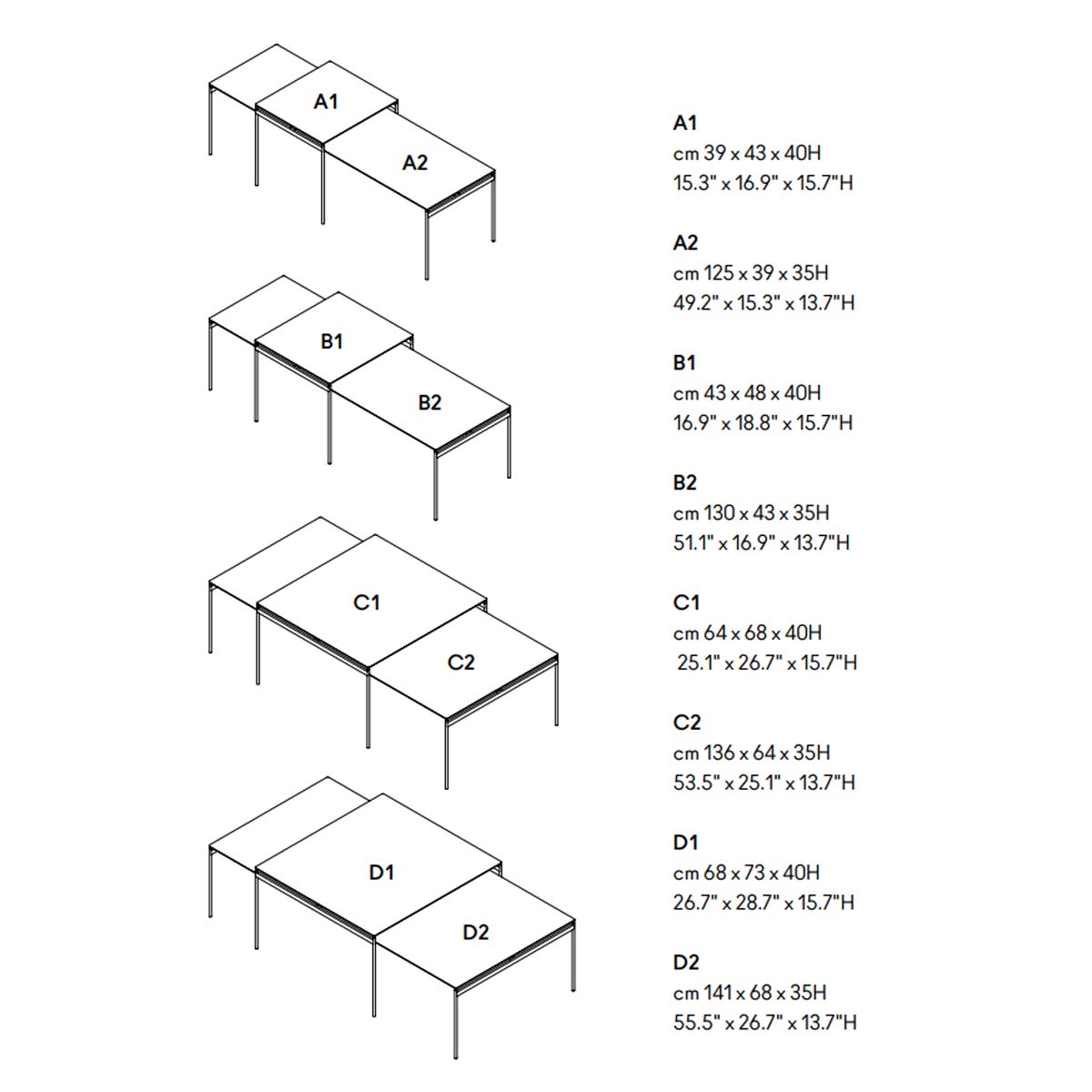 DIMENSIONI: A1 cm 39 x 43 x 40H - A2 cm 125 x 39 x 35H - B1 cm 43 x 48 x 40H - B2 cm 130 x 43 x 35H - C1 cm 64 x 68 x 40H - C2 cm 136 x 64 x 35H - D1 cm 68 x 73 x 40H - D2 cm 141 x 68 x 35H