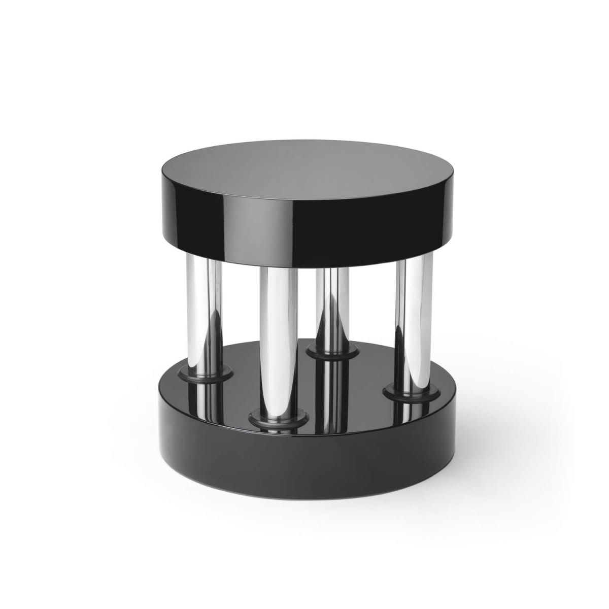 Memphis Milano Hyatt Black Tavolino di Ettore Sottsass è un tavolino di design basso rivestito in essenza lignea, elementi in metallo cromato. Nel 1984, Ettore Sottsass progetta due versioni del tavolino Hyatt: una rivestita in radica, destinata al catalogo Memphis; una con una laccatura in raffinato nero lucido per la base e per il piano. Quest’ultimo progetto ha una destinazione molto particolare: la sua casa a Milano. Oggi, Memphis la riprende e aggiunge al proprio catalogo. Hyatt è un tavolino eclettico e funzionale.“Memphis non nega l’utopia funzionale ma guarda alla funzionalità con occhio molto aperto, più da antropologo che da uomo di marketing. Funzionalità quindi non solo nel rispetto di alcune norme ergonomiche o delle statistiche di vendibilità ma anche nel rispetto della visione di una necessità pubblica, di una spinta storica”, scriveva nel 1981 Barbara Radice.