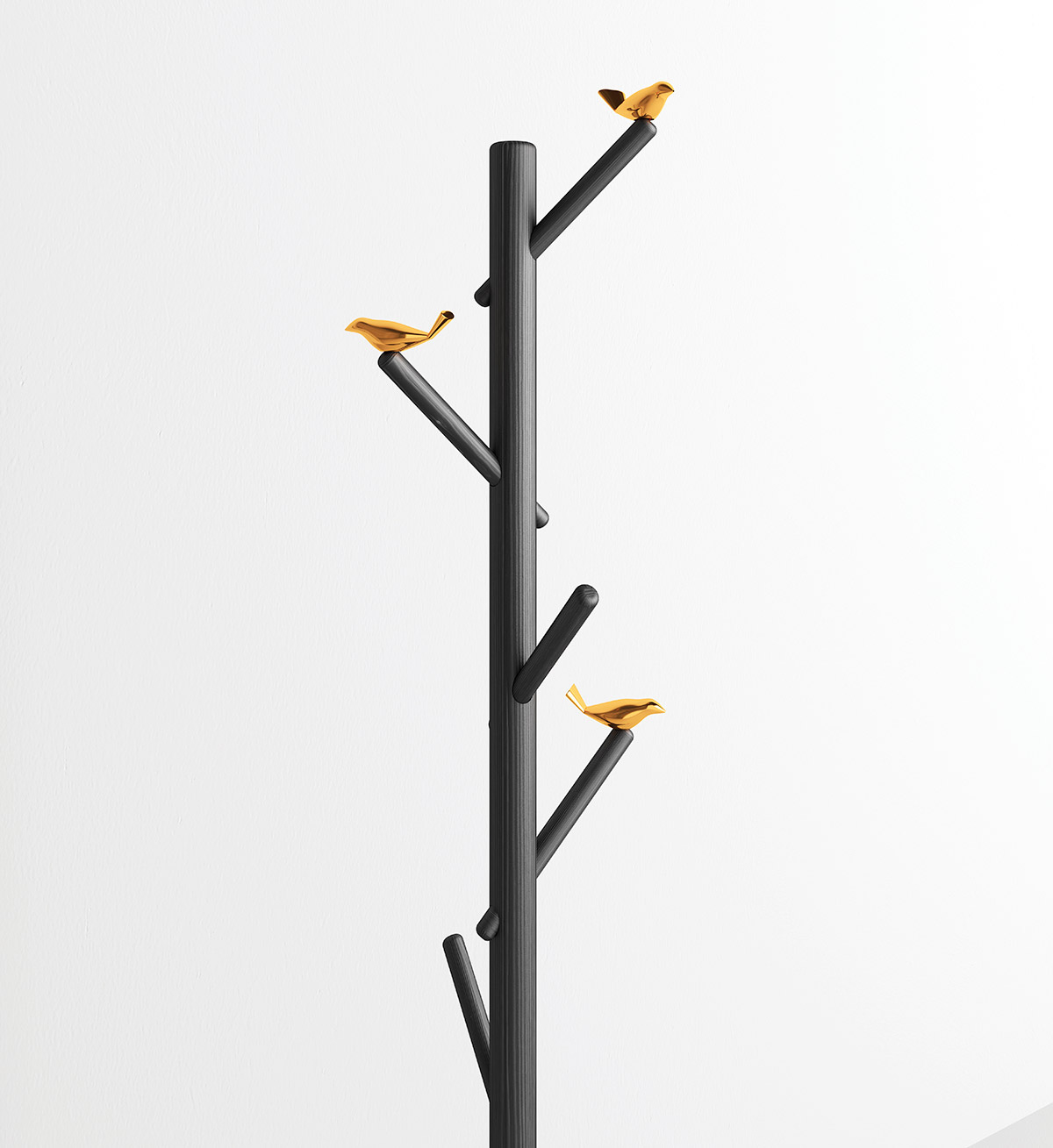 Bird Watch Hanger Appendiabiti da terra è l'appendiabiti da terra di design in legno di frassino, con uccellini in fusione di ottone in diverse finiture (ottone lucido, ottone satinato, nichel nero lucido, nichel nero satinato), disponibile in due versioni: da terra o da muro.